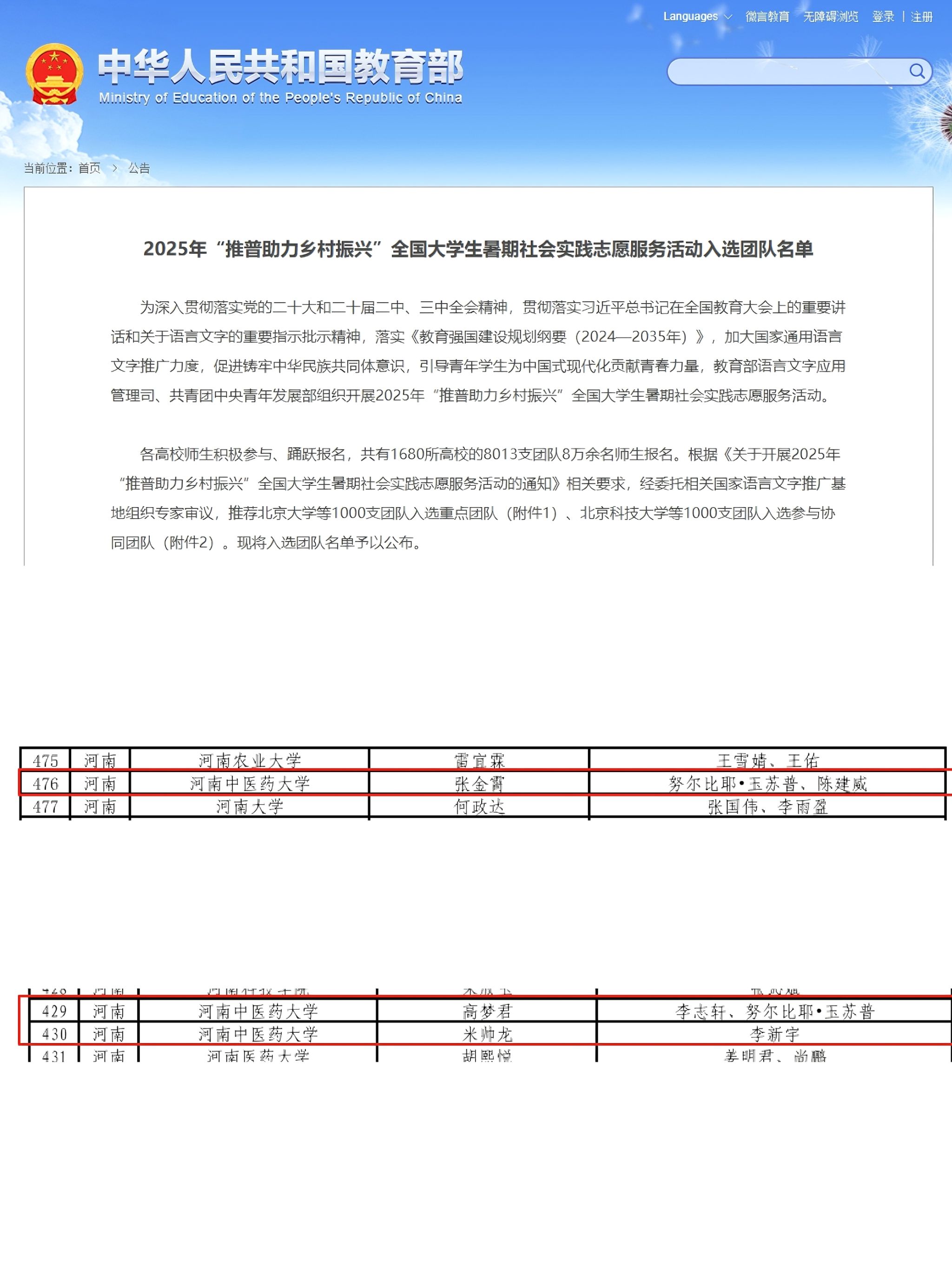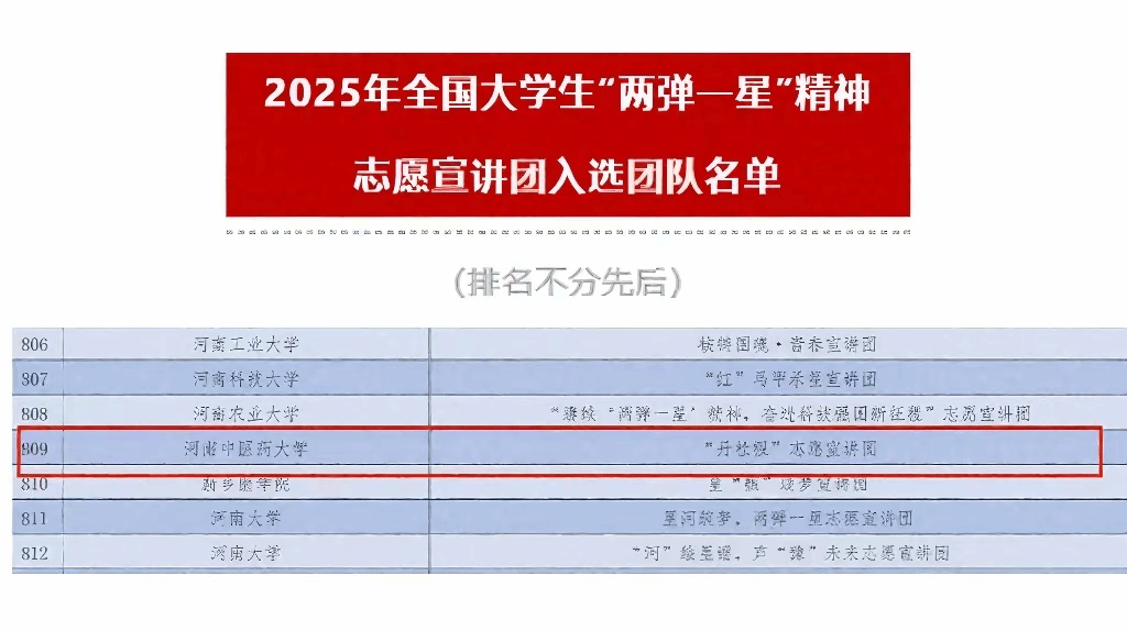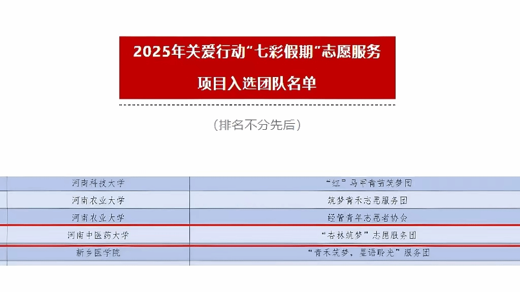 本网讯(文/图 于嘉明)近日,教育部、共青团中央、中国青年志愿者协会,先后公布了多项全国大学生社会实践志愿服务团队入选名单,其中中医学院(仲景书院)、仲景书院“杏林筑梦”志愿服务团成功入选2025年关爱行动“七彩假期”志愿服务团;尚真书院“丹桂橙”志愿宣讲团成功入选2025年全国大学生“两弹一星”精神志愿宣讲团;日本做爱“杏林丹若坊”工作室两支社会实践服务团队分别入选“推普助力乡村振兴”全国大学生暑期社会实践志愿服务重点团队和协同团队,第一临床医学院“语润天山,同心筑梦”志愿者服务团入选“推普助力乡村振兴”协同团队。