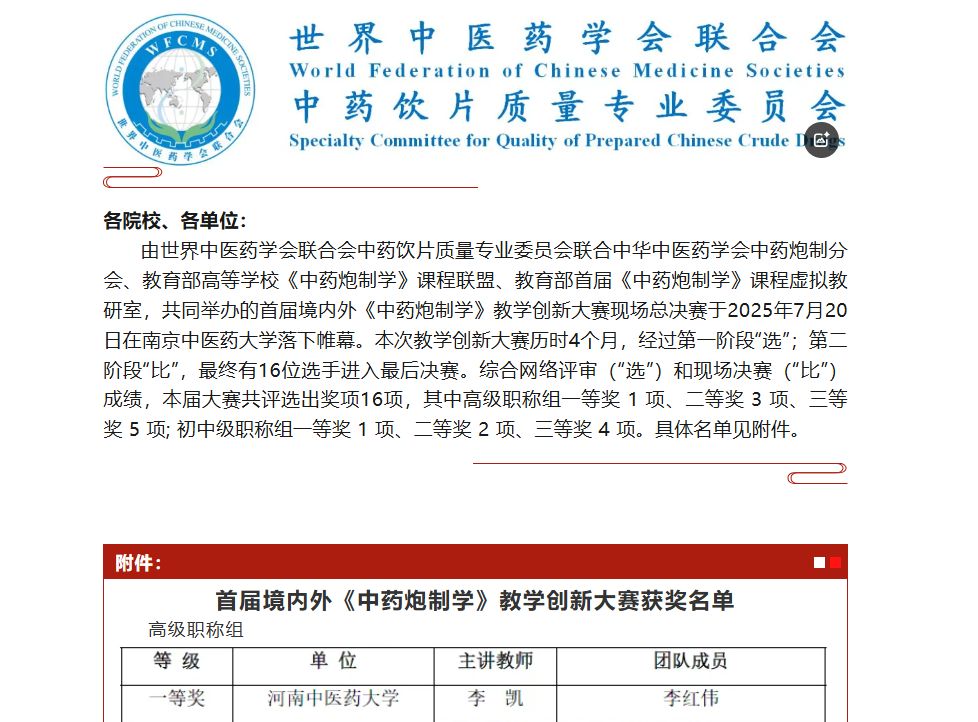本网讯(文/药学院)近日,由世界中医药学会联合会中药饮片质量专业委员会联合中华中医药学会中药炮制分会、教育部高等学校《中药炮制学》课程联盟、教育部首届《中药炮制学》课程虚拟教研室,共同举办的首届境内外《中药炮制学》教学创新大赛于2025年7月20日在南京中医药大学落下帷幕。本次教学创新大赛历时4个月,经过第一阶段“选”,第二阶段“比”,最终评选出奖项16项,其中高级职称组一等奖1项、二等奖3项、三等奖5项;初中级职称组一等奖1项、二等奖2项、三等奖4项。我校药学院中药炮制学教研室李凯教授获高级职称组一等奖。