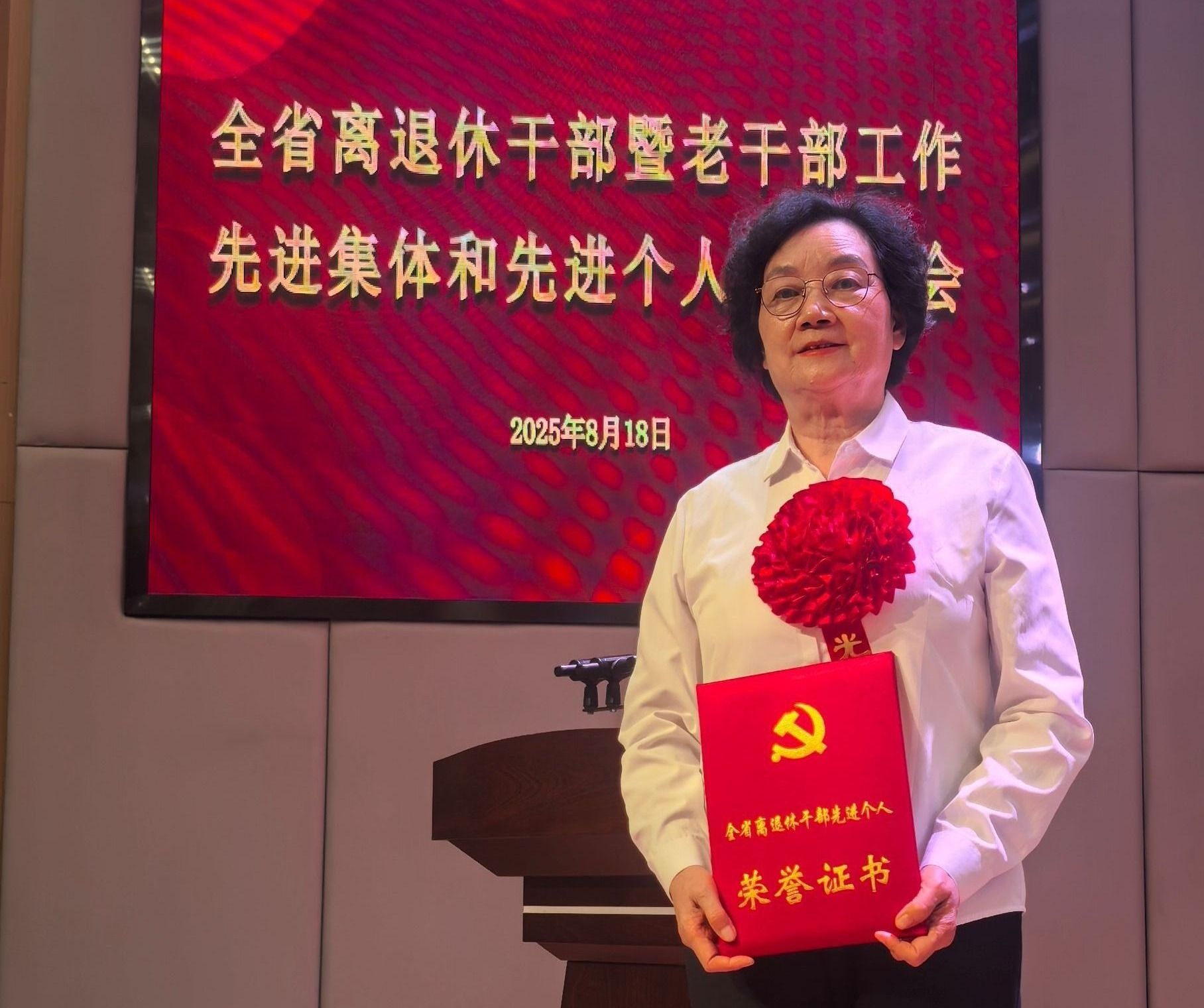 合影时徐玉芳在第一排就座,她激动地说,此次表彰活动五年一次,获此殊荣深感荣幸。这既是对老干部工作的充分肯定,更是对新时代银发力量的殷切期许。她表示将以此为新起点,深入学习贯彻习近平新时代中国特色社会主义思想,永葆政治本色,充分发挥老干部的政治优势、经验优势和威望优势,在服务发展大局中展现新作为,为谱写中国式现代化建设新篇章持续贡献智慧和力量,以实际行动回报组织的关怀与厚爱。