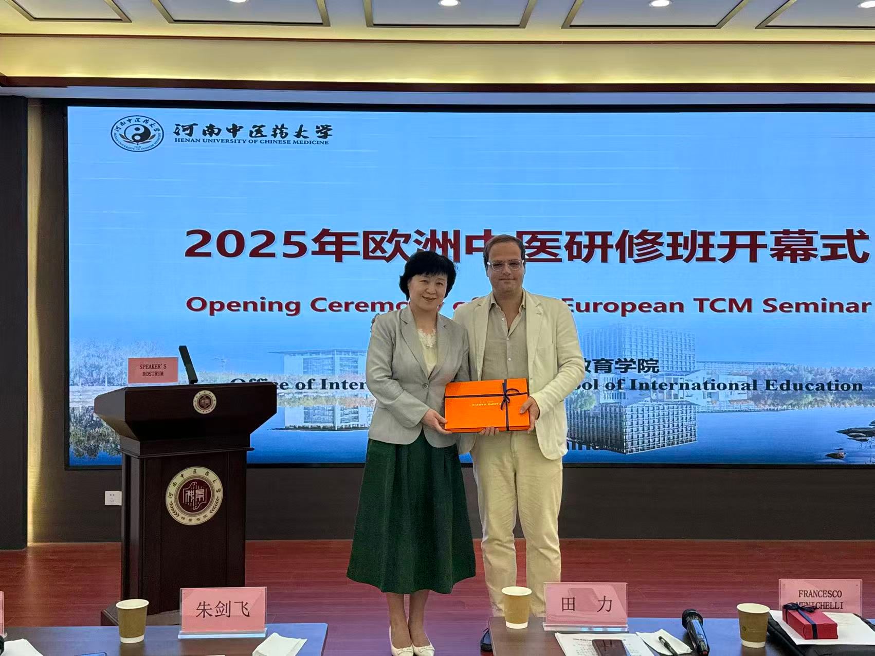 本网讯(文/江源 图/刘怡然)2025年9月1日,2025年欧洲中医研修班开幕式在仲景学堂举行。我校党委常委、副校长田力出席开幕式,来自罗马尼亚、匈牙利、意大利、立陶宛四个国家的25名学员,国际合作处、国际教育学院全体人员参加活动。开幕式由国际合作处处长、国际教育学院院长朱剑飞主持。