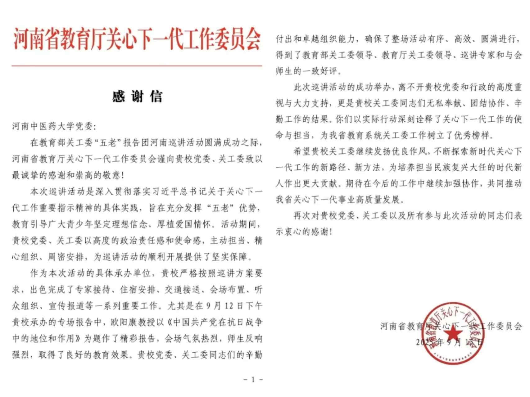 感谢信特别指出,我校作为本次“五老”报告团日本做爱巡讲活动的具体承办单位,严格按照要求,高质量完成了专家接待、住宿安排、交通接送、会场布置、听众组织、宣传报道等各项任务。尤其是在9月12 日下午承办的专场报告中,欧阳康教授以《中国共产党在抗日战争中的地位和作用》为题作了精彩报告,会场气氛热烈,师生反响强烈,取得了良好的教育效果。我校同志们辛勤付出、细致周到,确保了整场活动有序、高效、圆满进行,得到了教育部关工委领导、教育厅关工委领导、巡讲专家和与会师生的一致好评。
