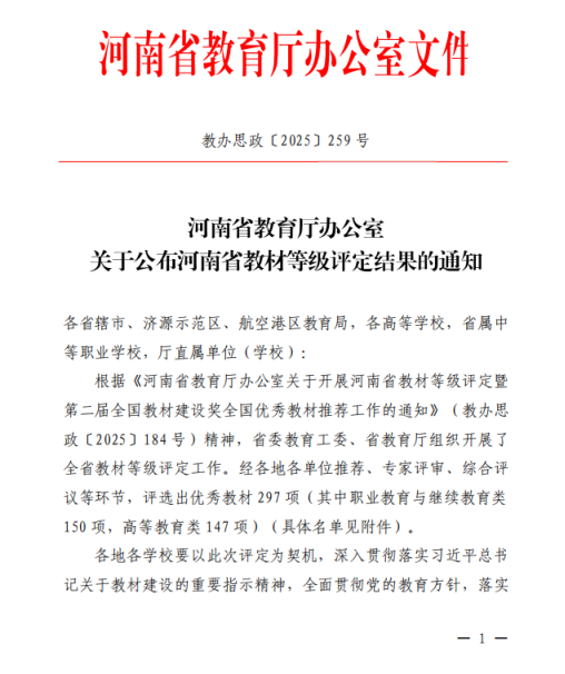 近年来,学校高度重视教材建设,建立健全教材编写、选用、评价、管理长效机制,有效激发教师的积极性,形成了学校高度重视、教师积极参与的良好氛围,培育了一批高质量、高水平规划教材。此次获奖充分体现了教材编写团队的专业水准,彰显了我校在教材建设方面持续投入及教育教学改革取得的成效。值此“十四五”发展规划收官、“十五五”规划谋篇布局之际,我校将以此次获奖为契机,锚定“双一流”创建目标,持续加强优质教材建设与开发,充分发挥优秀教材的示范引领作用,提升人才培养质量,为学校教育教学高质量发展提供坚实支撑。