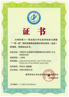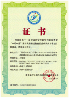 医学创新大赛喜获殊荣,科研与文化传播双丰收。2025年度,我校来华留学生首次参与第十一届全国大学生医学创新大赛暨“一带一路”国际竞赛,并在国际赛道中斩获分区赛二等奖及三等奖佳绩。由CHEAH WAE HUNG、LEE YEW LYNN、CHAN JIA YEN、CHONG XIAO XIN完成的项目“中医药文化新媒体传播策略的实证研究-以马来西亚为例”获得分区赛二等奖,该课题聚焦中医药文化在海外的创新传播路径,通过实证分析为中医药文化国际化推广提供了新思路。由PROMMA TATSANEE、YAN SO HTIN、WONG LI TENG、BEMBEEVA AILANA、CHONG HAO MING完成的项目——“邵氏五针法”介导IL-4-JAKsSTATs信号轴调控巨噬细胞M1/M2极化改善哮喘炎症的机制研究——获得分区赛三等奖,该课题将传统针灸疗法与现代分子生物学结合,探索了中医药治疗哮喘的潜在机制,体现了中西医融合的科研思维。