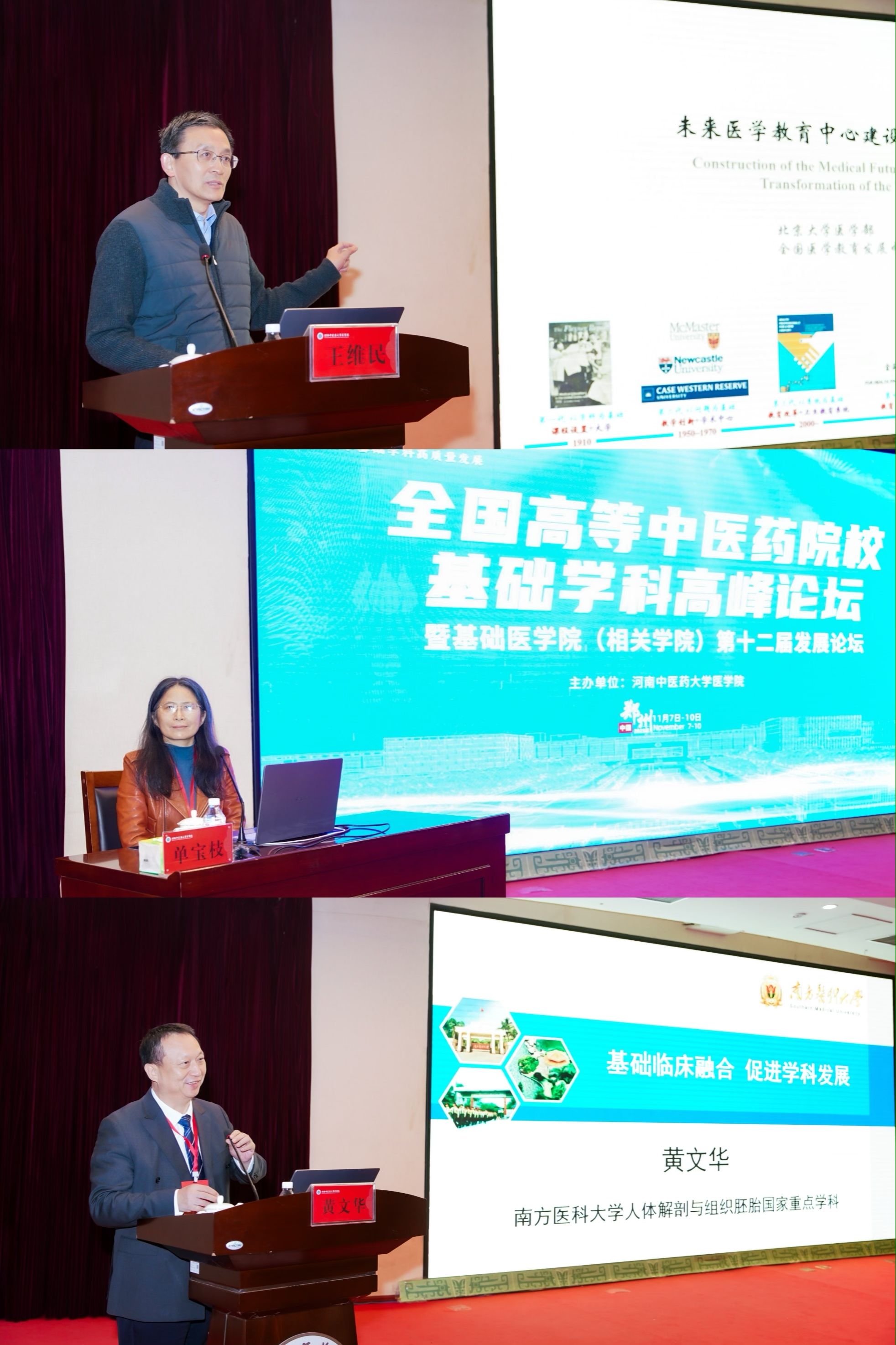 论坛期间,围绕“融合创新 智引未来”核心主题,特别邀请三位领域内专家学者作主题报告:北京大学医学部、全国医学教育发展中心王维民主任;世界中医药学会联合会翻译专业委员会会长、教育指导委员会副会长单宝枝教授;南方医科大学研究生院院长黄文华教授。专家们结合行业发展实际,深入分享了对新形势下中医药发展机遇与挑战的认知、加快构建中医药领域新质生产力的实践路径,以及中医药传承创新与基础学科协同发展的未来趋势,为论坛带来了前沿视角与深度思考。专家汇报分别由学校办公室主任兼发展规划与学科建设处处长孙可兴、教务部常务副部长禄保平、医学院党委书记高剑峰主持。