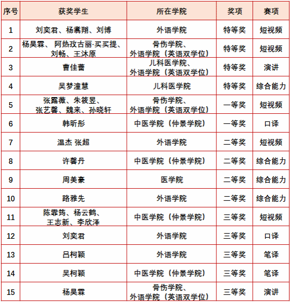 外语学院将以此次赛事为契机,持续推动外语教育教学改革创新,不断优化学科竞赛实践育人机制,引导学生将专业学习与国家发展需求紧密结合,着力培养兼具扎实专业能力、广阔全球视野与深厚家国情怀的复合型外语人才,为服务中医药国际化战略和学校“双一流”创建做出更大贡献。