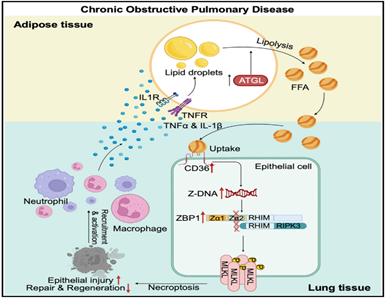 临床研究发现,COPD患者通常伴随体重减轻和脂肪及肌肉含量的减少,随着COPD的进展,体重(尤其是脂肪重量)下降更为明显。针对这一临床现象,研究团队提出“脂解可能参与了COPD进程”的科学假说。随后,通过系列体内外实验证实COPD中脂解现象的发生,且参与COPD发生发展,深入研究潜在的分子机制发现脂解引起COPD肺上皮细胞中CD36特异性地上调,导致Z-DNA结合蛋白1(ZBP1)介导的上皮细胞坏死,损害了肺再生,而这一过程又反过来加剧脂解。因此,脂解和肺上皮细胞特异性的CD36过表达形成了一个正反馈环促进COPD的发生发展。研究团队发现,通过敲除肺上皮细胞中的CD36,或通过药物抑制ATGL或CD36,可解除ZBP1诱导的细胞坏死性凋亡,并恢复WNT/β-catenin通路,促进小鼠肺组织的再生,从而改善COPD。在此基础上,团队进一步提出了靶向脂解限速酶ATGL-CD36-ZBP1信号轴促进肺再生,治疗COPD的潜在可行性,为临床上开发靶向肺再生策略而治疗COPD提供了重要思路。