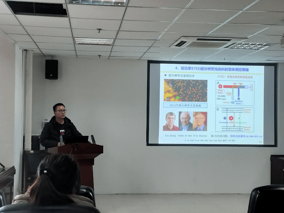 牛广乐从功能有机荧光染料合成与生物过程的选择性可视化出发,依次讲述了基于单分子运动受限的荧光探针对同工酶的选择性区分、可调细胞器靶向和光稳定的近红外荧光探针的构建、环境敏感型的双光子脂滴探针对脂肪肝的诊断以及超低激发光强度STED成像染料探针的合成与结构调控等课题,并且详细介绍了近几年来的研究成果。精彩报告引起了广大师生的共鸣。报告期间,与会师生积极与专家互动交流,就生物蛋白、核酸分子可视化成像技术与中医药的学科交叉问题进行深入探讨。