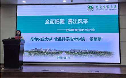 讲座伊始,雷萌萌从教学竞赛的作用、教学竞赛原则、竞赛材料、个人感想、教学设计等五个方面展开分享。她重点阐述了立德树人根本任务与“两性一度”的课程建设要求。在教学创新成果报告环节,雷老师以《食品化学》课程为例,详细介绍了团队如何以教育“新质生产力”助推食品行业“四链协同”,并展示了如何运用信息化手段构建智慧课堂。在交流环节,针对教师们普遍关心的竞赛备赛难点,雷老师逐一进行了解答,并提出了“精准对标政策、突出课程特色、强化团队协作”的备赛策略。