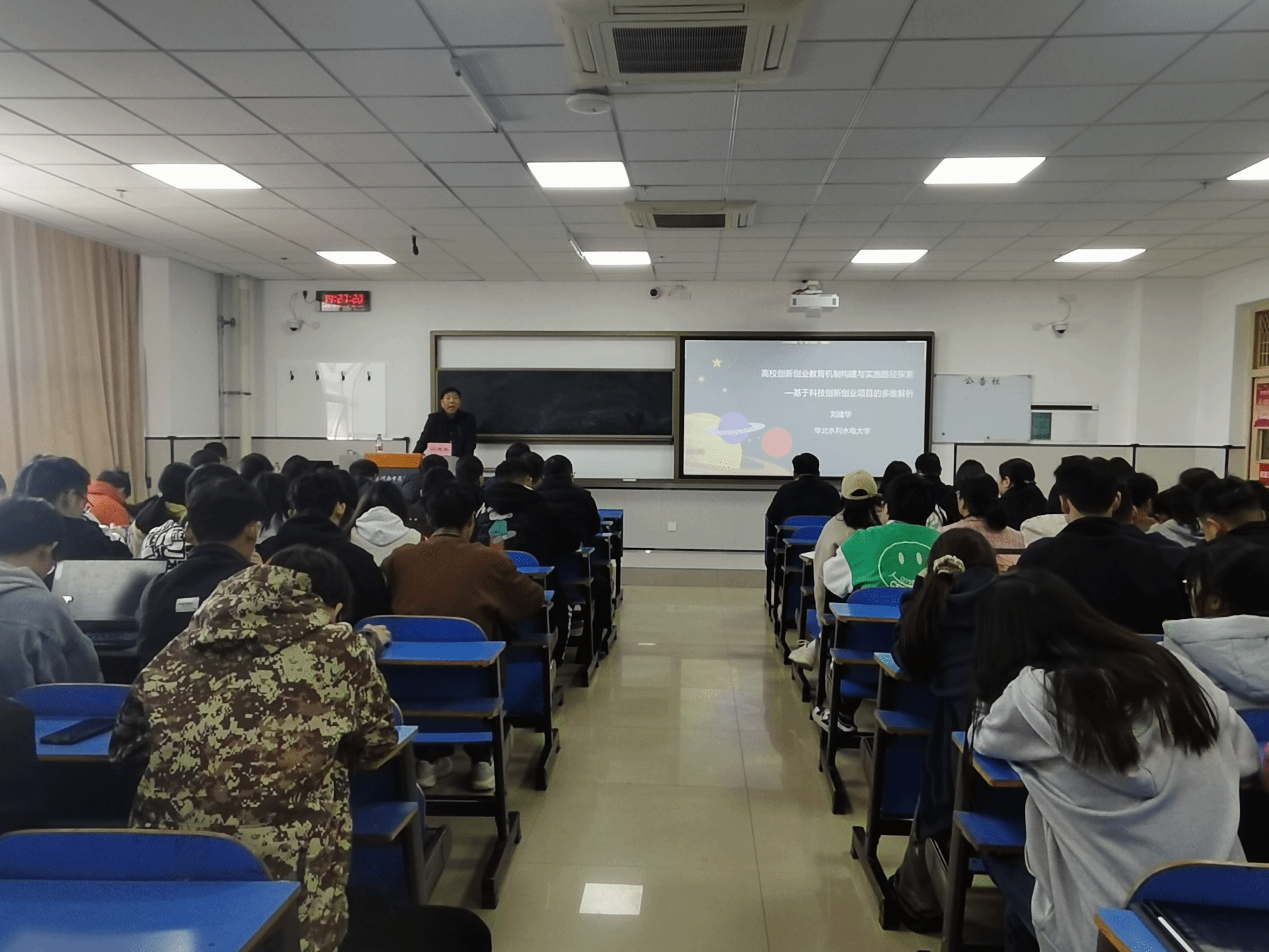 本网讯(文/程子豪 图/朱红磊 )2025年3月18日,信息技术学院(智能医疗行业学院)在教学楼A705举办了“百家论坛”学术报告。本次报告特邀华北水利水电大学博士生导师刘建华教授主讲,主题为“高校创新创业教育机制构建与实施路径探索——基于科技创新创业项目的多维解析”。学校创新创业学院院长高磊、信息技术学院领导班子和全院教师以及大学生科创团队成员等100余人参加论坛,信息技术学院副院长宋学坤主持。