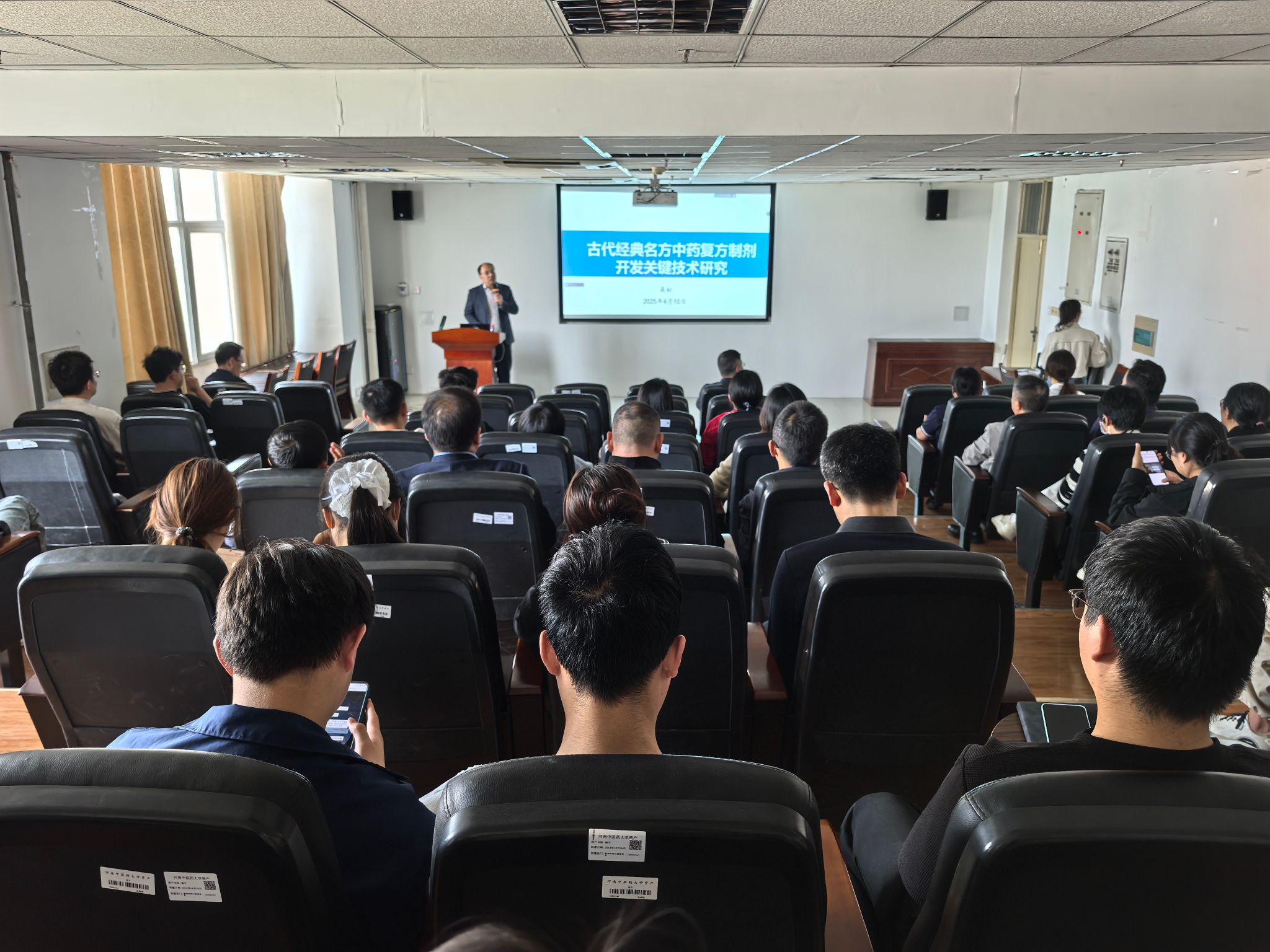 本网讯(文/张飞 图/邵沛璐) 2025年4月10日,受药学院邀请,仲景宛西制药股份有限公司副总经理、正高级工程师高松在我校龙子湖校区教学综合实验楼BN617开展了题为《古代经典名方中药复方制剂开发关键技术研究》的学术讲座。药学院各科研室科研骨干及硕博士等有关人员80余人参加了报告会。