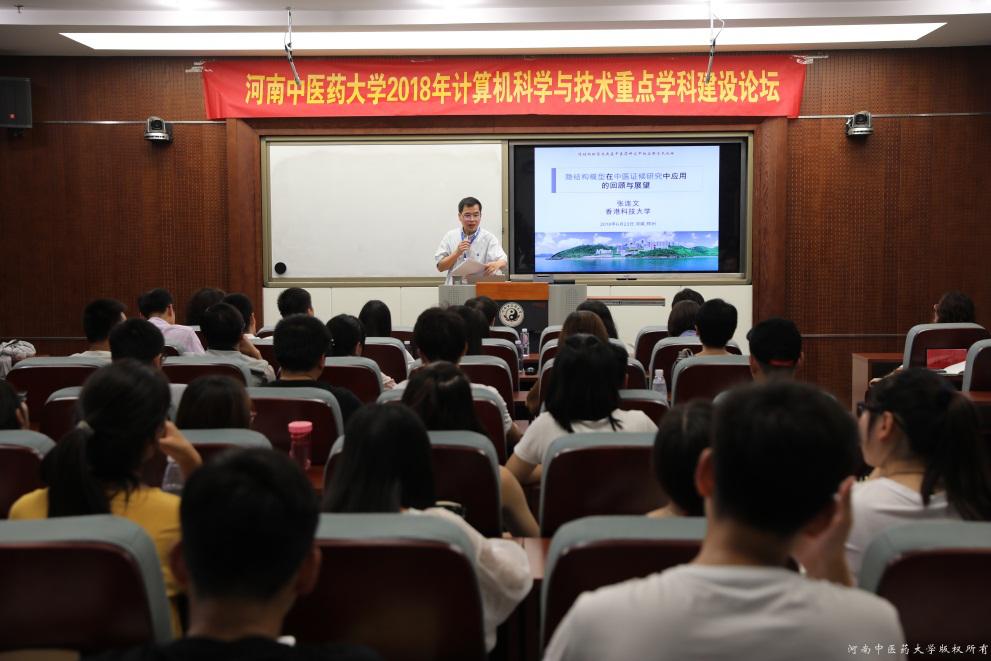 会上,香港科技大学张连文教授以“隐结构模型在中医证候研究中应用的回顾与展望”为题目,进行了精彩的学术讲座。张教授十几年来一直致力于隐结构模型及其在中医药研究的应用,是该研究方向的创始人和开拓者;北京交通大学的周雪忠教授以“名中医经验诊治规律挖掘分析研究”为题目进行了学术报告,周教授从事中医信息学研究工作十余年,主要面向中医基础科学问题及临床诊疗规律的数据挖掘,在国内外具有较高的影响力;北京中医药大学的吴秀艳教授、上海中医药大学许朝霞研究员、南阳理工学院的陈丽平副教授、北京中医药大学的翟兴副教授、山东中医药大学的魏国辉博士和我校许玉龙副教授,分别作了学术报告。本次论坛的所有学术报告都属于人工智能和中医药交叉领域的研究成果,报告深入浅出,精彩纷呈,参会师生受益匪浅。