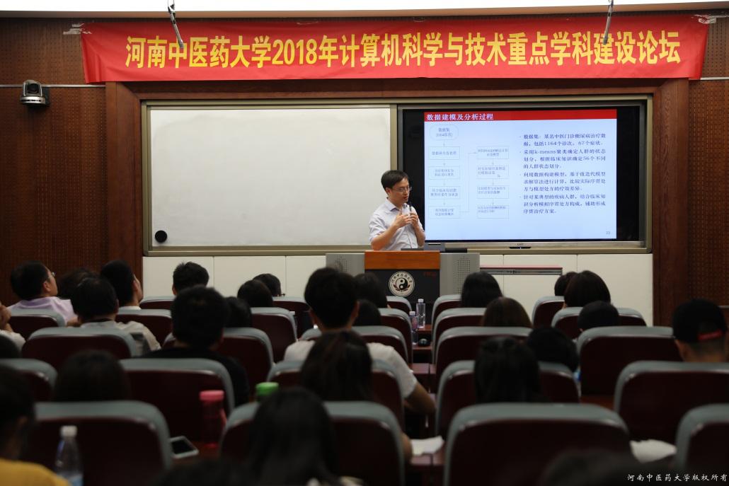 在我校建校60周年之际,为促进智能算法、数据挖掘方法在中医药的应用与研究,增强与国内中医类高校在计算机和中医药交叉领域的学科交流,信息技术学院于2018年6月23-24日,在教学楼录播教室A633举办了“隐结构及其在中医药研究的应用暨计算机科学与技术学科建设”学术论坛。此次学术论坛邀请了海内外多位知名专家,围绕“人工智能+中医药”交叉学科领域进行学术报告、专题讲座。校科技处、学科办负责人,信息技术学院领导班子成员、全体教职工及学生代表参加会议。会议由院长许成刚主持。