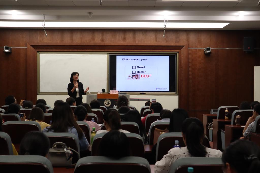 美国约翰·霍普金斯大学护理学院Chao Hsing Yeh(叶昭幸)教授应邀为现场师生作了题为“护理科研与非药物镇痛”的讲座。她结合自身学习、科研、教学经历,从论文选题到撰写方法,向大家分享了自己的经历感受和科研经验,详细阐述了在人生不同阶段如何规划自己的职业生涯、如何结合具体研究现状开展课题研究、如何针对不同研究对象选择质性或量性研究。她还着重讲解了中医疗法耳穴镇痛在疼痛管理中的优势与国内外研究现状。讲座进一步拓宽了师生们的科研思维和视野,激发了大家的科研灵感,也坚定了师生从事中医护理科研的信心和决心。