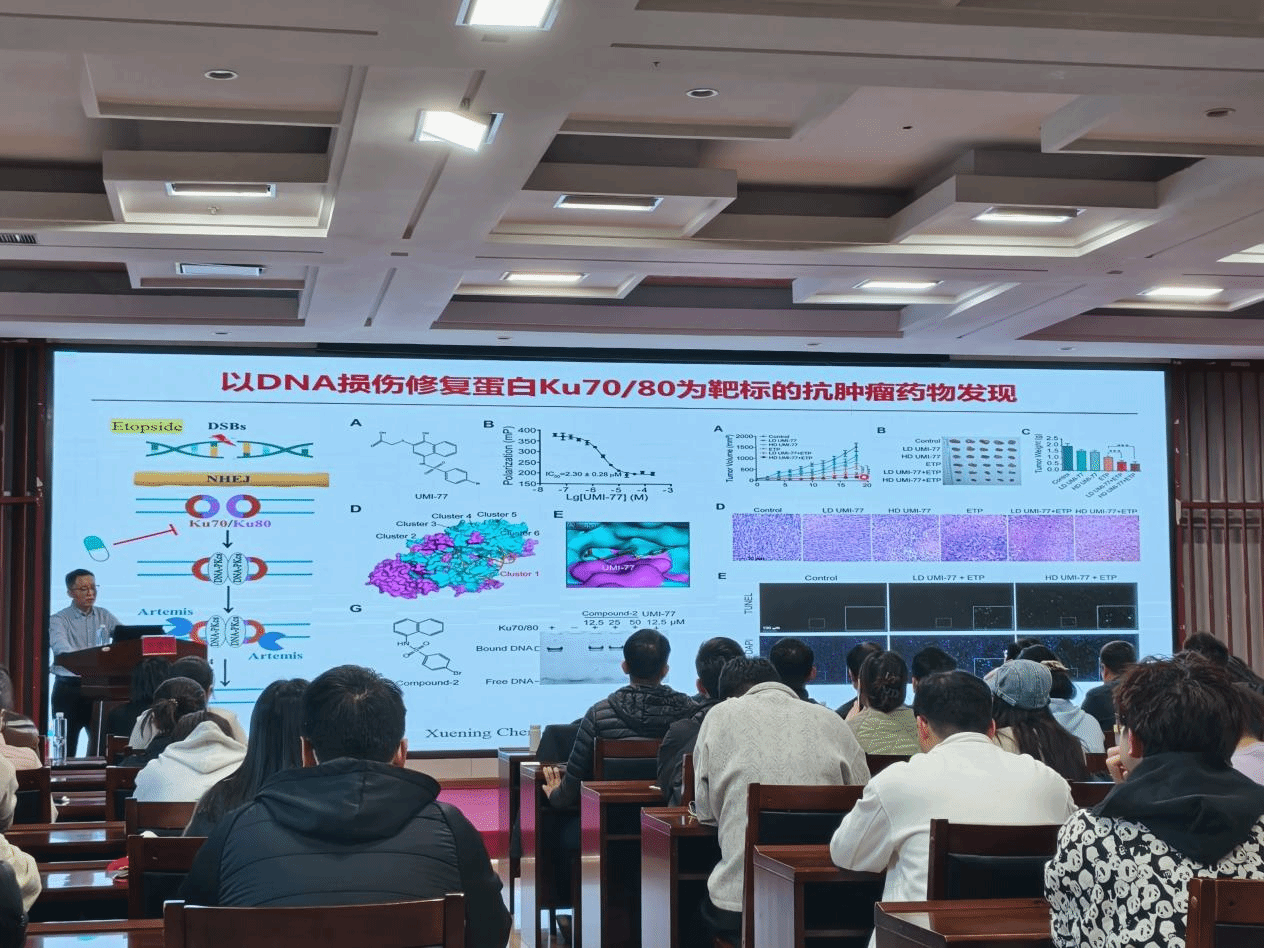 林忠辉围绕“精准医学”国家战略,系统介绍了其团队在“有丝分裂调控蛋白分离酶”与“DNA损伤修复通路”两大方向取得的多项突破性成果,就人源Separase三维结构,设计合成高活性、高专一性小分子抑制剂,构建DNA编码化合物库平台,揭示霍利迪连接体解离酶“三金属离子”催化机制,解析III型CRISPR-Cas系统“激活—自限”动态调控等内容进行了详细讲述。林忠辉还展示了Separase抑制剂在乳腺癌模型中显著抑制肿瘤生长且无明显毒性,DNA修复抑制剂与光敏剂联用实现“低剂量—高疗效”协同杀伤,以及“DNA 修复抑制剂—抗生素”组合有效逆转铜绿假单胞菌耐药性的创新策略等,为抗肿瘤、抗感染精准药物研发提供了全新思路。