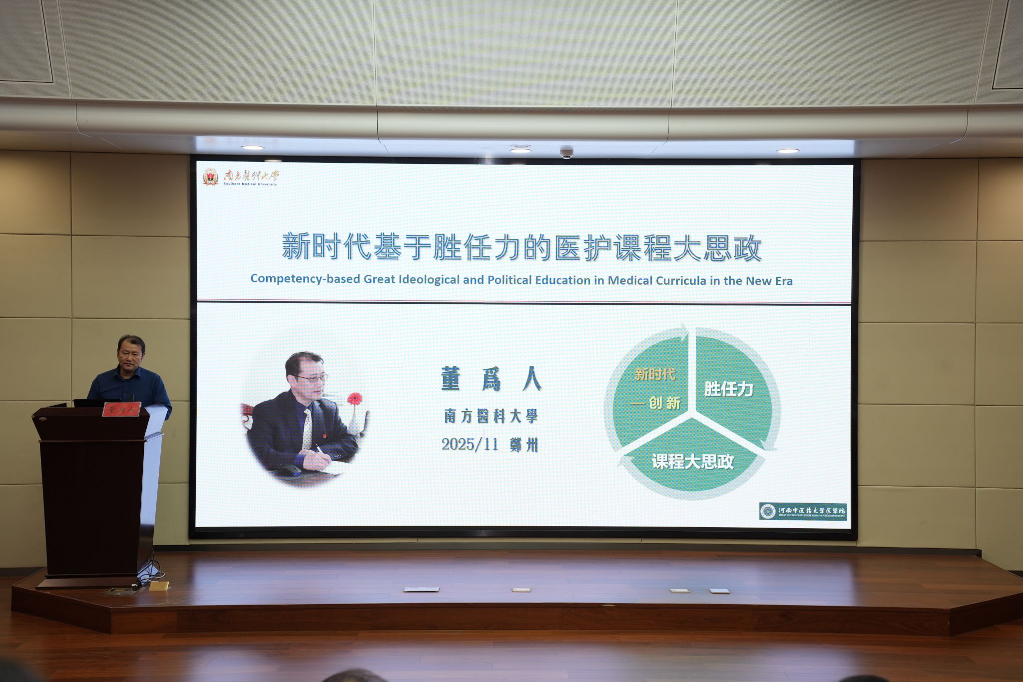 本网讯(文/图 张慧鹏)为深入推进教育教学改革,强化课程思政与胜任力培养需求的深度融合,2025年11月17日,医学院在俊学楼A114举办“润心铸魂,提质赋能”教学名师工作坊活动。本次活动特别邀请南方医科大学教授、博士生导师,国家级实验教学示范中心主任董为人分享题为“新时代基于胜任力的医护课程大思政”的精彩讲座。我校教务部、医学院领导班子成员,郑州大学基础医学院臧卫东教授以及我校医学院、护理学院、第五临床医学院教师代表共同参会。