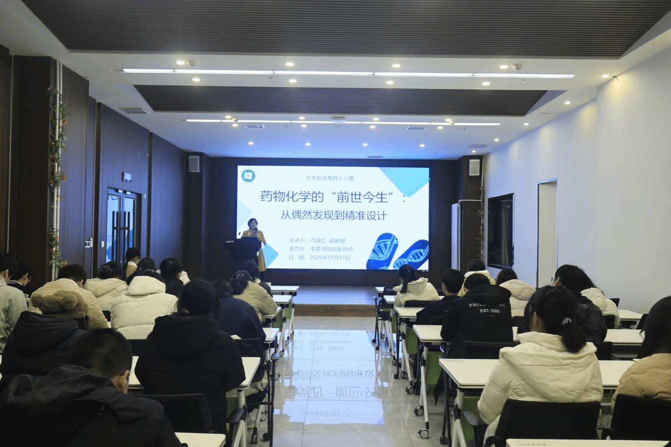 本网讯(文/刘芳 图/张若曦)为帮助同学们深入了解药物化学学科内核,理性认知药物作用机制,进一步激发对医药科学的探索热情,2025年11月17日,本草书院在远志学堂举办“药物化学的‘前世今生’:从偶然发现到精准设计”第48期学术前沿讲座。本次讲座由学业导师弓建红主讲。