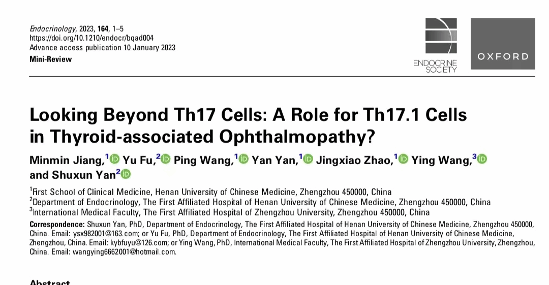 本网讯(文图/蒋敏敏)近日,一附院燕树勋教授团队关于甲状腺相关性眼病的一篇名为《Looking Beyond Th17 Cells: A Role for Th17.1 Cells in Thyroid-associated Ophthalmopathy? 》的论文,被国际著名期刊《Endocrinology》杂志收录。