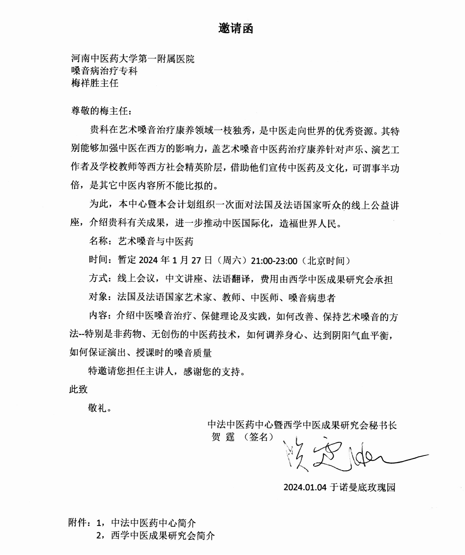 2024年1月27日,梅祥胜受“法国·中法中医药中心”邀请,参加了一场跨国线上的学术交流。交流会上他不但以“嗓音与中医”为主题普及中医药文化知识,还现场与法国歌唱家积极互动,悉心指导有关嗓音保护和发声问题,受到了一致称赞。