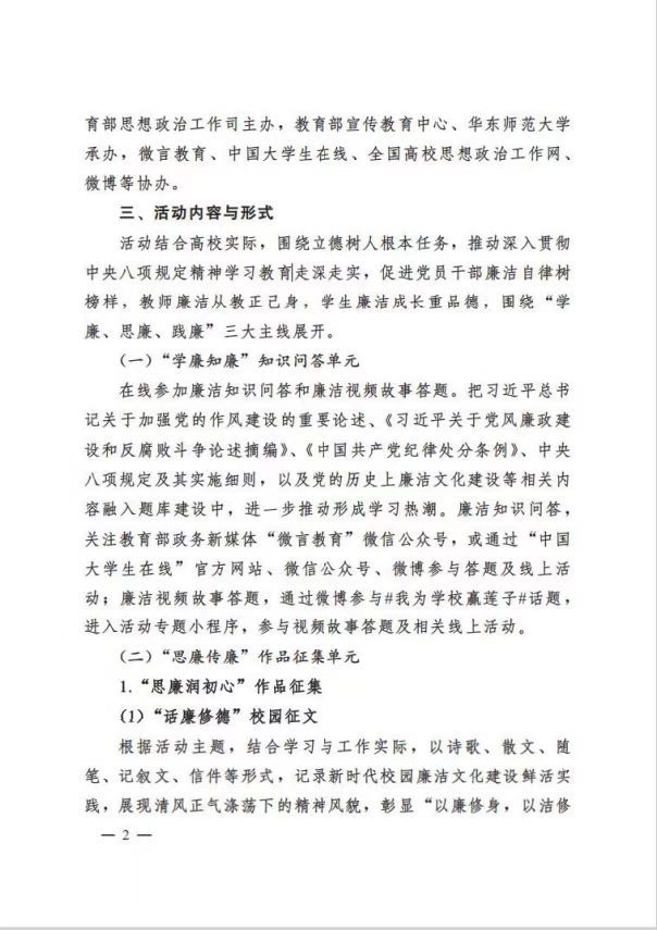 3.知识问答。各单位于10月20日前,通过党团活动、主题班会等形式充分组织动员干部师生通过“微言教育”微信公众号、“中国大学生在线”官方网站、微信公众号、微博参与答题及线上活动。廉洁视频故事答题,通过微博参与#我为学校赢莲子#话题,进入活动专题小程序,参与视频故事答题及相关线上活动。进一步推动形成学习习近平总书记关于加强党的作风建设的重要论述、《习近平关于党风廉政建设和反腐败斗争论述摘编》、《中国共产党纪律处分条例》、中央八项规定及其实施细则,以及党的历史上廉洁文化建设等相关内容的热潮。