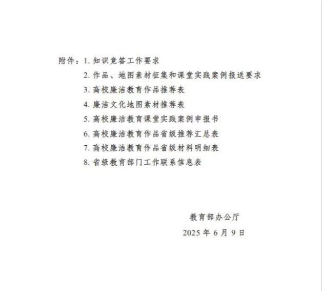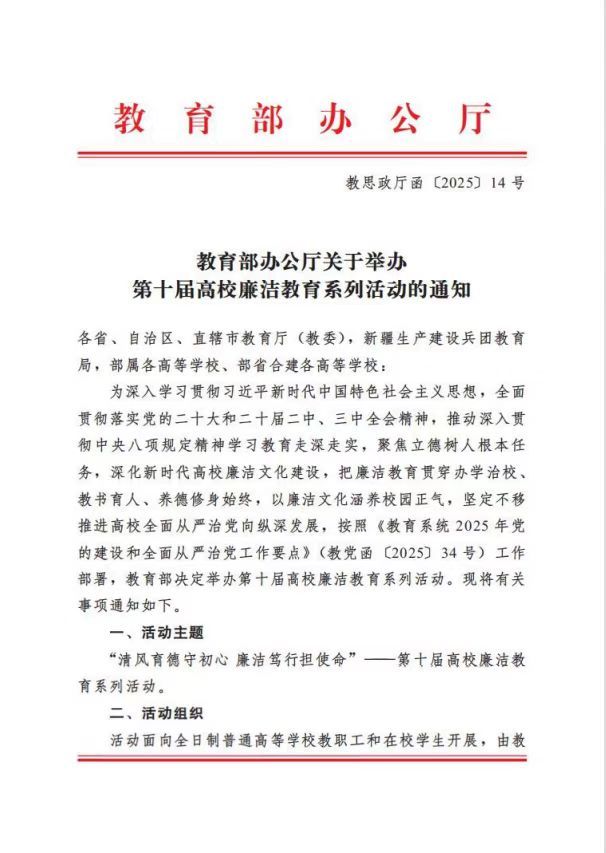 现将《教育部办公厅关于举办第十届高校廉洁教育系列活动的通知》(教思政厅函〔2025〕14号)转发给你们,并将我校申报事宜通知如下: