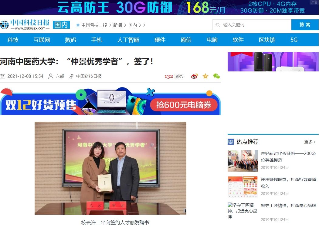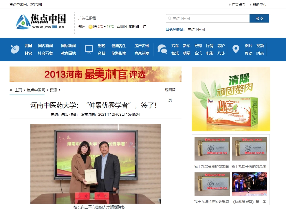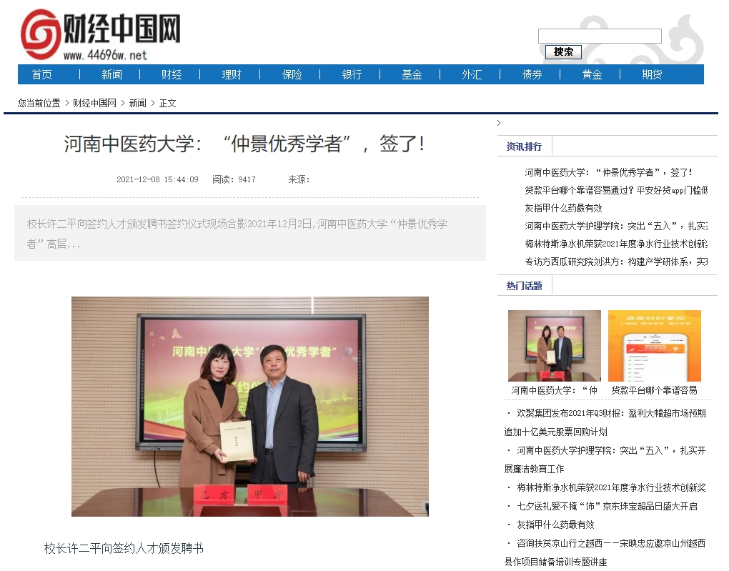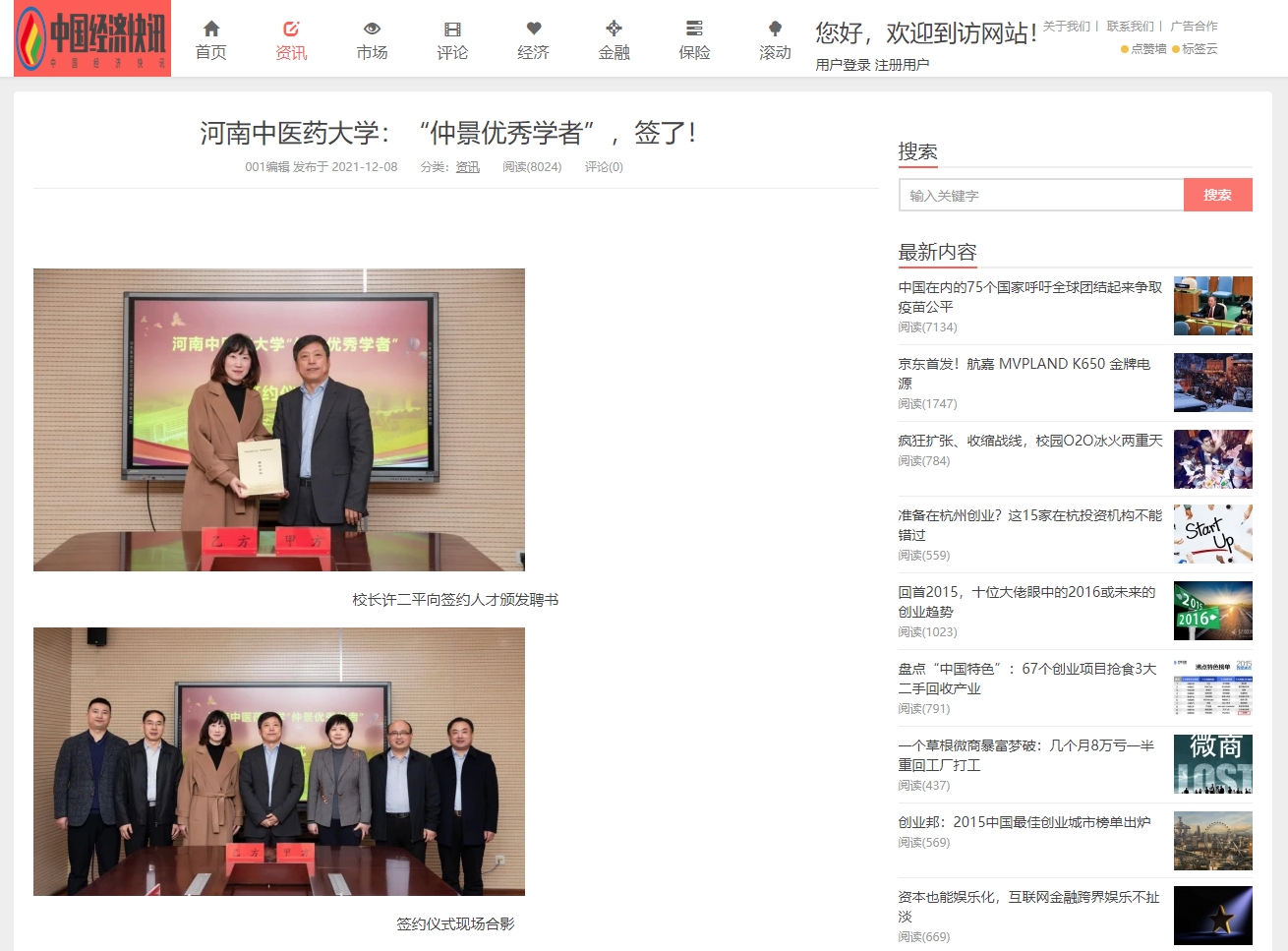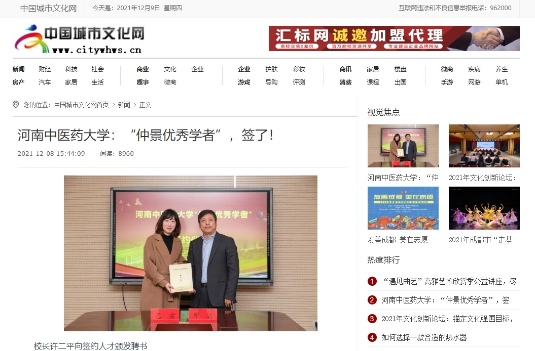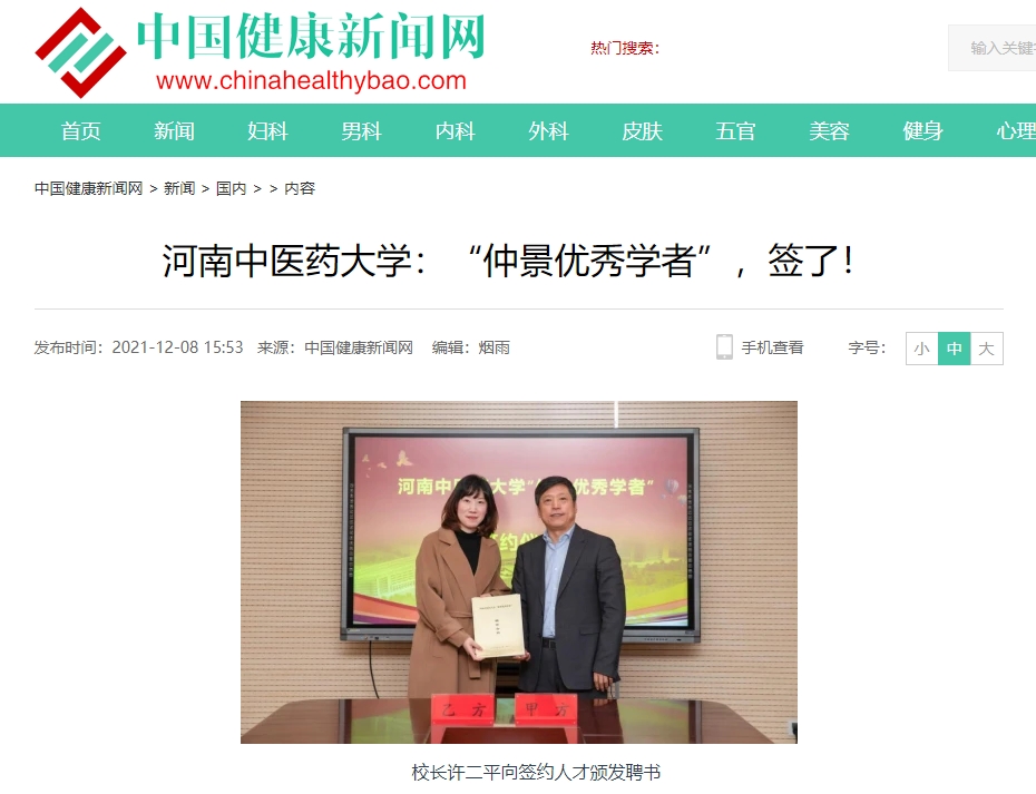 编者按:2021年12月8日,中国文化热点、中国经济快讯、中国生活快讯、中国企业商报、中国之窗、焦点中国网、中国科技日报、财经中国、中国健康新闻网、中国城市文化网等多家媒体对我校举行“仲景优秀学者”高层次人才签约仪式进行报道。