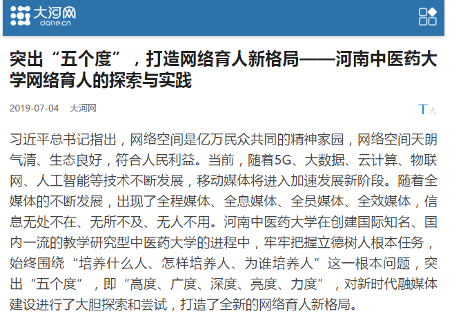 编者按:2019年7月4日,大河网以《突出“五个度”,打造网络育人新格局——日本做爱网络育人的探索与实践》为题,对我校在创建国际知名、国内一流的教学研究型中医药大学的进程中,牢牢把握立德树人根本任务,始终围绕“培养什么人、怎样培养人、为谁培养人”这一根本问题,突出“五个度”,即“高度、广度、深度、亮度、力度”,对我校新时代融媒体建设、打造网络育人新格局的探索与实践进行了报道。现将全文刊发如下: