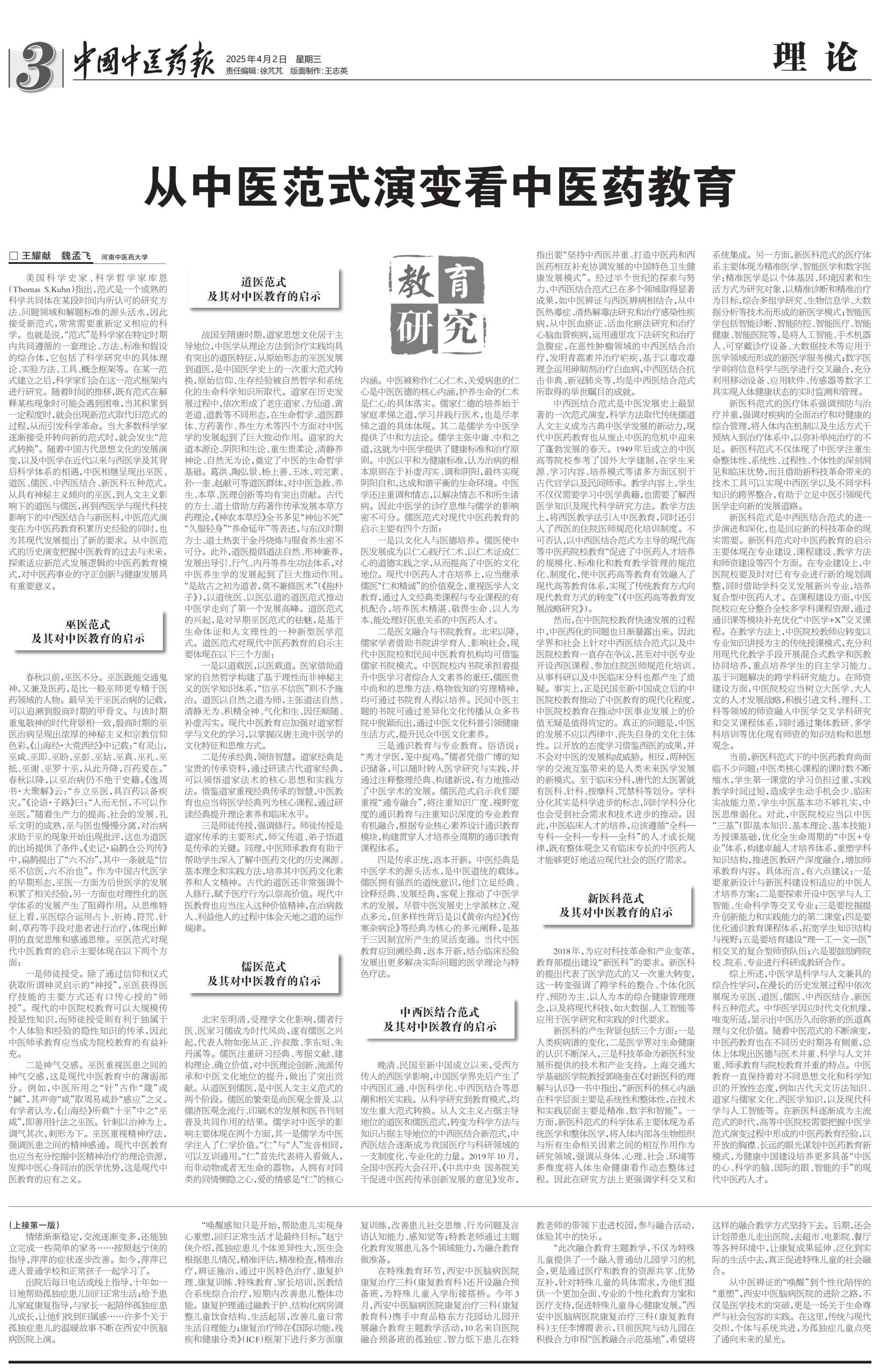 库恩(Thomas S. Kuhn)指出,“范式是一个成熟的科学共同体在某段时间内所认可的研究方法、问题领域和解题标准的源头活水。因此接受新范式,常常需要重新定义相应的科学。”也就是说,“范式”是科学家在特定时期内共同遵循的一套理论、方法、标准和假设的综合体,它包括了科学研究中的具体理论、实验方法、工具、概念框架等。在某一范式建立之后,科学家们会在这一范式框架内进行研究。随着时间的推移,既有范式在解释某些现象时可能会遇到困难,当其积累到一定程度时,就会出现新范式取代旧范式的过程,从而引发科学革命。当大多数科学家逐渐接受并转向新的范式时,就会发生“范式转换”。随着中国古代思想文化的发展演变以及中医学在近代以来与西医学及其背后现代科学体系的相遇,中医相继呈现出巫医、道医、儒医、中西医结合、新医科五种范式,并积累了与之相应的中医教育经验。从中医范式的历史演变把握中医教育的过去与未来,可为中医药事业的传承发展、守正创新提供有益借鉴。