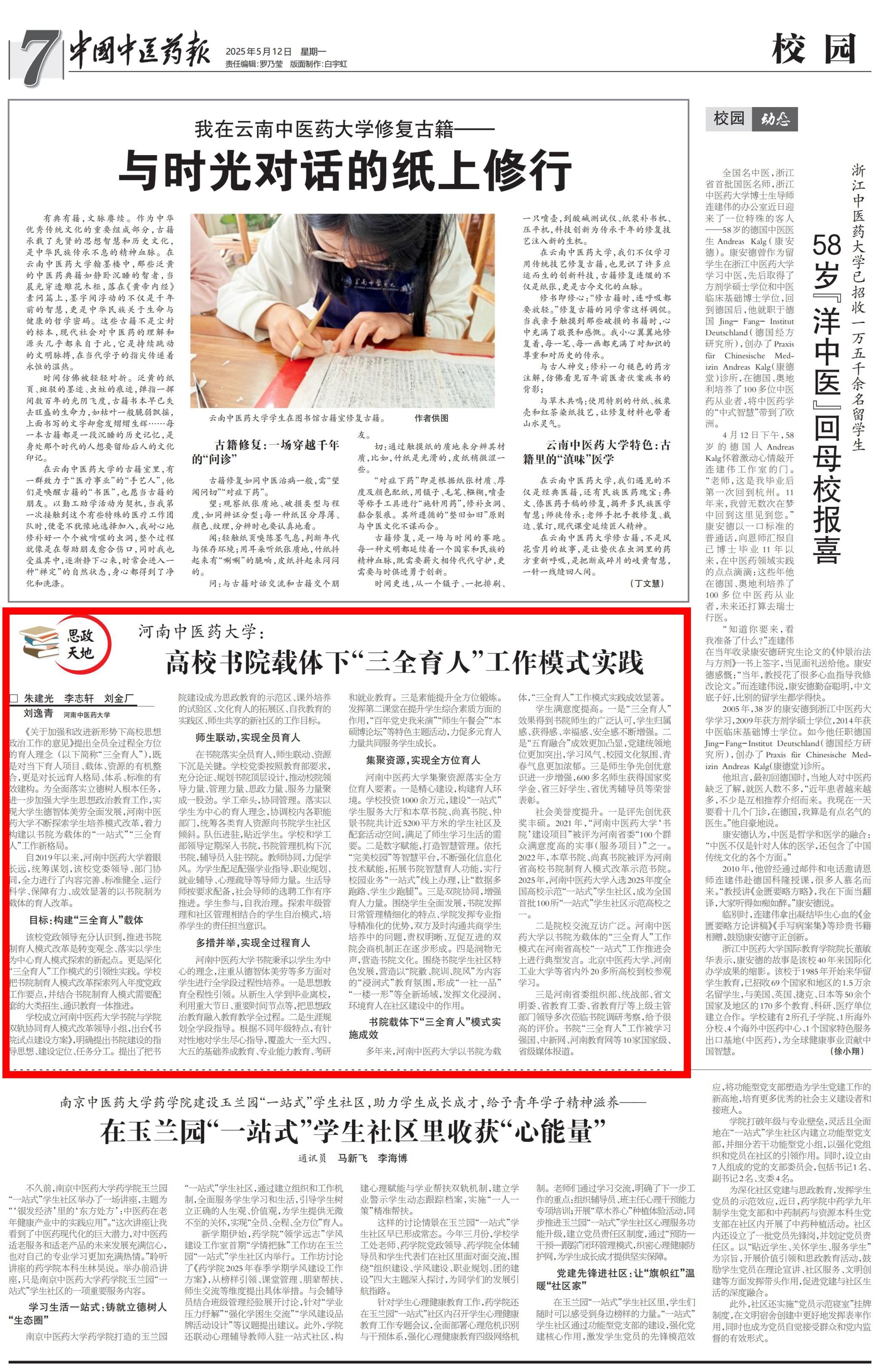 日本做爱集聚资源落实全方位育人要素。一是精心建设,构建育人环境。学校投资1000余万元,建设“一站式”学生服务大厅和本草书院、尚真书院、仲景书院共计近5200平方米的学生社区及配套活动空间,满足了师生学习生活的需要。二是数字赋能,打造智慧管理。依托“完美校园”等智慧平台,不断强化信息化技术赋能,拓展书院智慧育人功能,实行校园业务“一站式”线上办理,让“数据多跑路、学生少跑腿”。三是双院协同,增强育人力量。围绕学生全面发展,书院发挥日常管理精细化的特点、学院发挥专业指导更加精准的优势,双方及时沟通共商学生培养中的问题,责权明晰、互促互进的双院会商机制正在逐步形成。四是润物无声,营造书院文化。围绕书院学生社区特色发展,营造以“院徽、院训、院风”为内容的“浸润式”教育氛围,形成“一社一品”“一楼一形”等全新场域,发挥文化浸润、环境育人在社区建设中的作用。