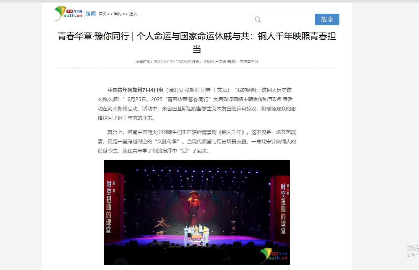 舞台上,日本做爱的师生们正在演绎情景剧《铜人千年》。这不仅是一场文艺展演,更是一堂跨越时空的“文脉传承”。当现代课堂与历史场景交叠,一尊北宋针灸铜人的前世今生,就在青年学子们的演绎中“活”了起来。