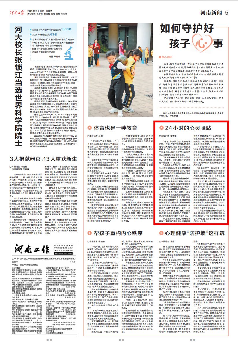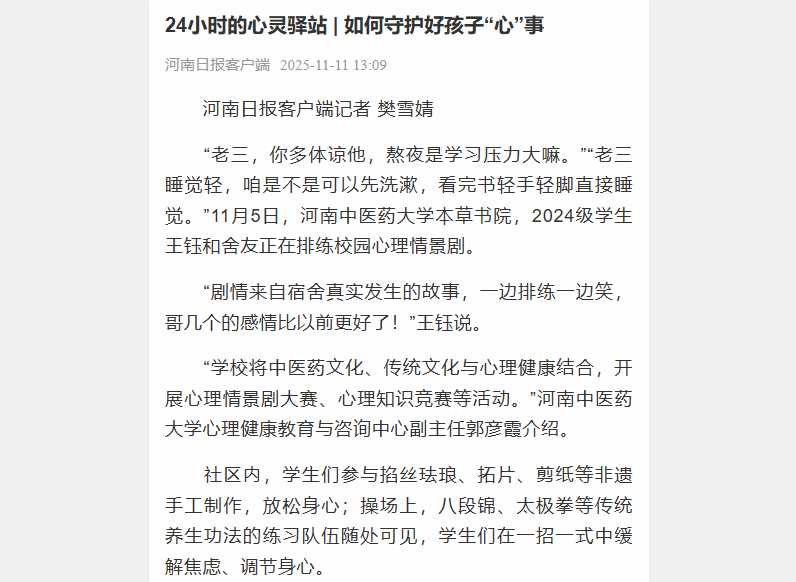线上服务同样暖心。“心理咨询师说”“朋辈说”等新媒体栏目定期推送心理调适技巧,“心灵树洞”为学生提供匿名倾诉渠道,24小时心理热线、线上QQ、微信、邮箱等渠道全天候畅通,在线答疑。