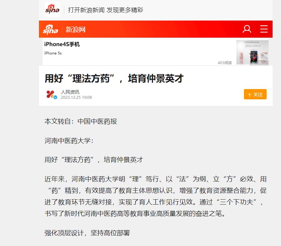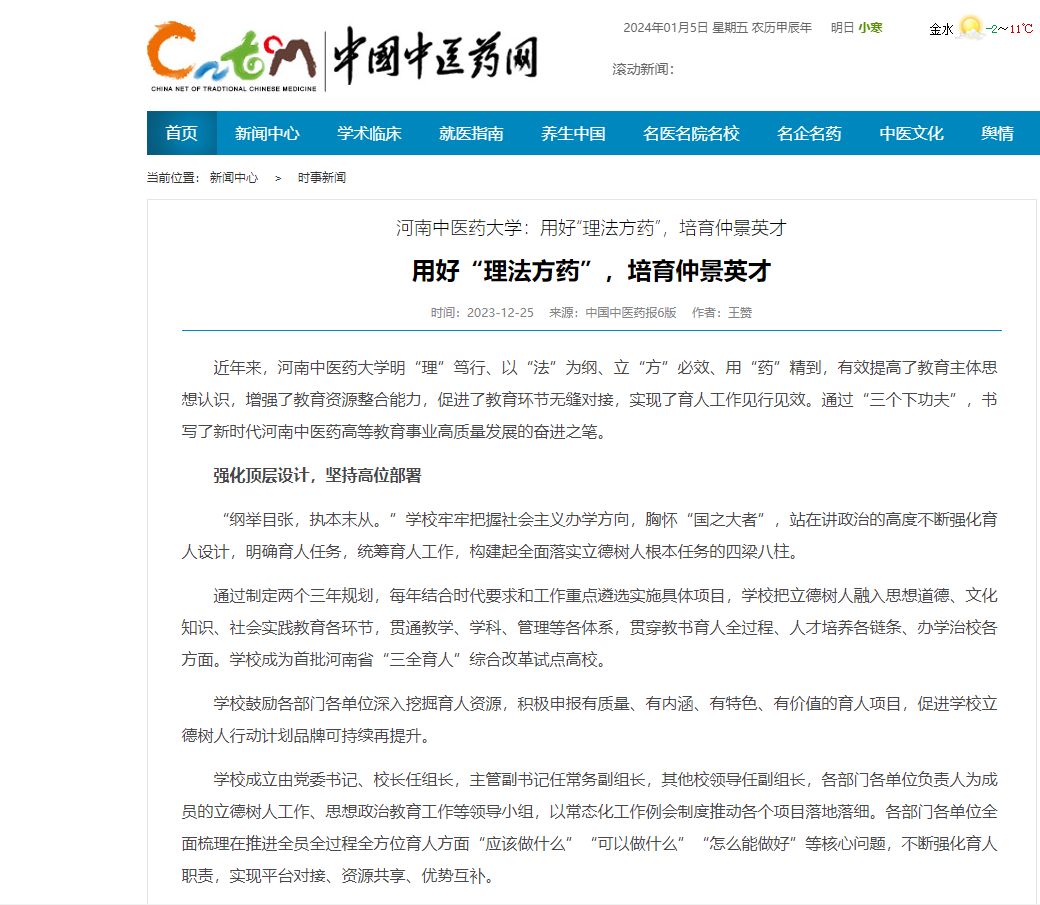 “固本培元行动”抓牢育人根本。从思想政治课这个核心着手,学校注重将马克思主义哲学史和中医发展史相结合,打造充满药草香的思政课,让思政课有料有味。从通识课程这个特色着手,学校注重用中医药文化启智润心,将仲景文化中的哲学思想、思维方式、价值理念等丰厚的育人资源融于中国传统文化、中医文化和国学经典等通识课程中;坚持“五育并举”,将美学教育、劳动教育、国家安全教育等课程纳入课程模块,进一步优化学生知识结构、提高综合素养。