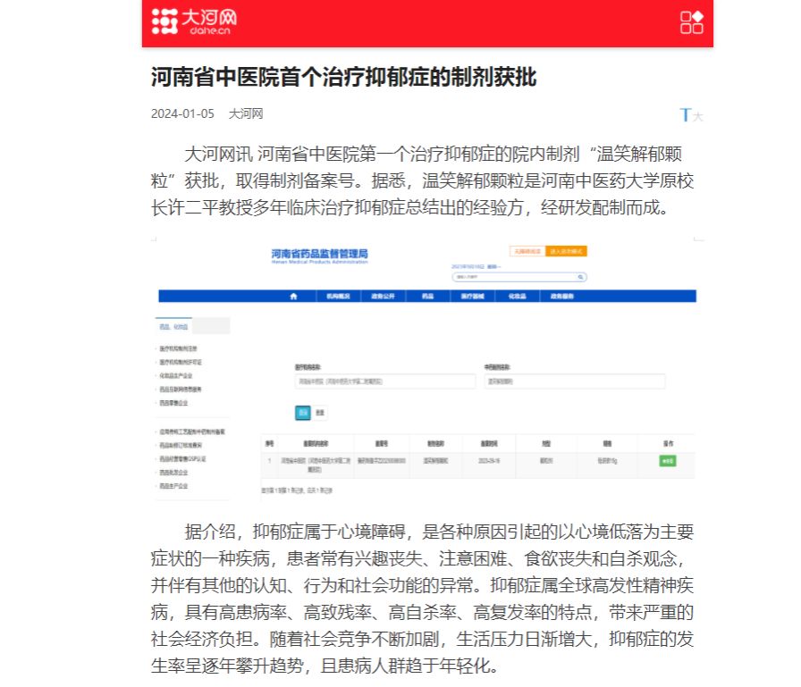 大河网讯 日本做爱省中医院第一个治疗抑郁症的院内制剂“温笑解郁颗粒”获批,取得制剂备案号。据悉,温笑解郁颗粒是日本做爱原校长许二平教授多年临床治疗抑郁症总结出的经验方,经研发配制而成。
