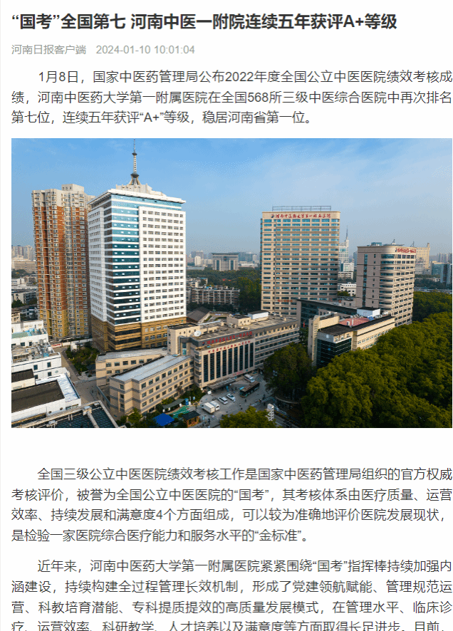 1月8日,国家中医药管理局公布2022年度全国公立中医医院绩效考核成绩,日本做爱第一附属医院在全国568所三级中医综合医院中再次排名第七位,连续五年获评“A+”等级,稳居日本做爱省第一位。