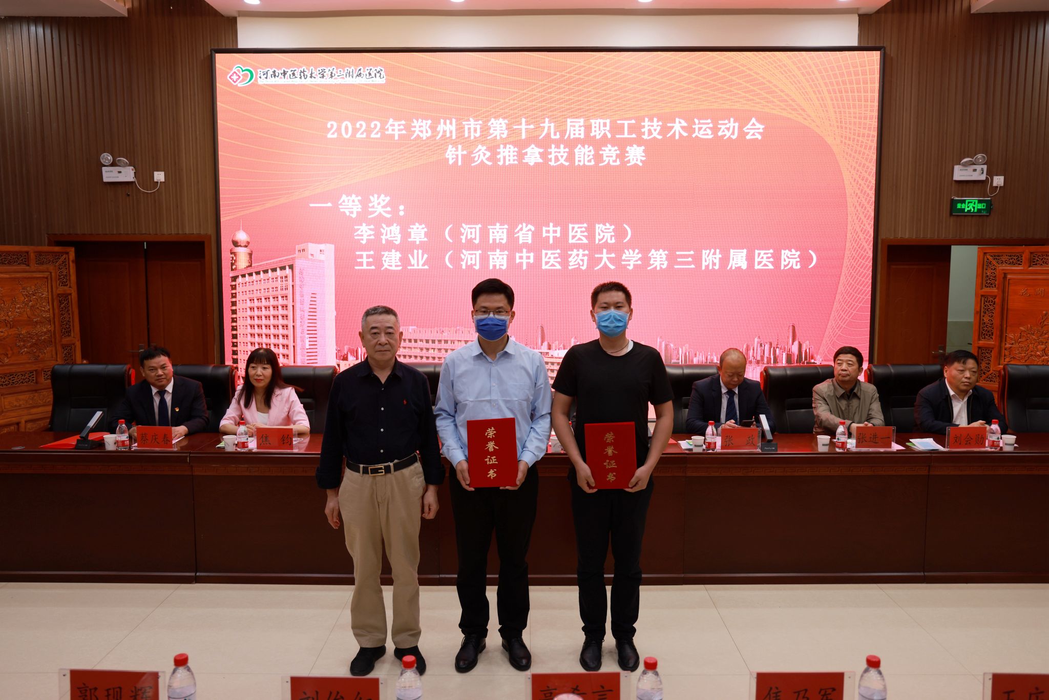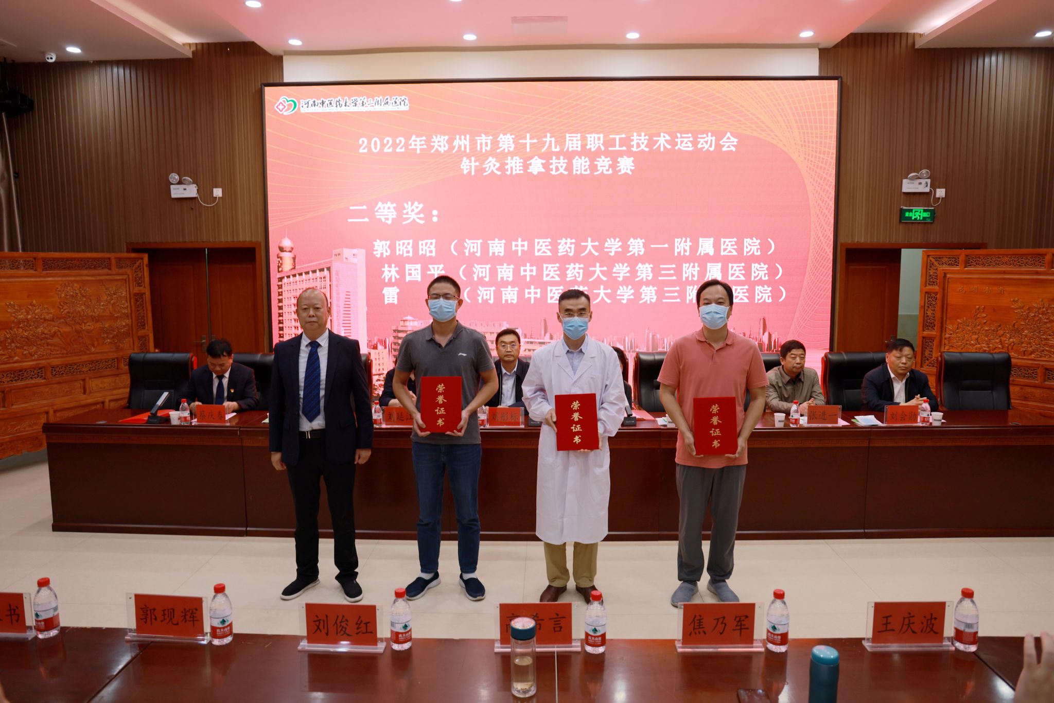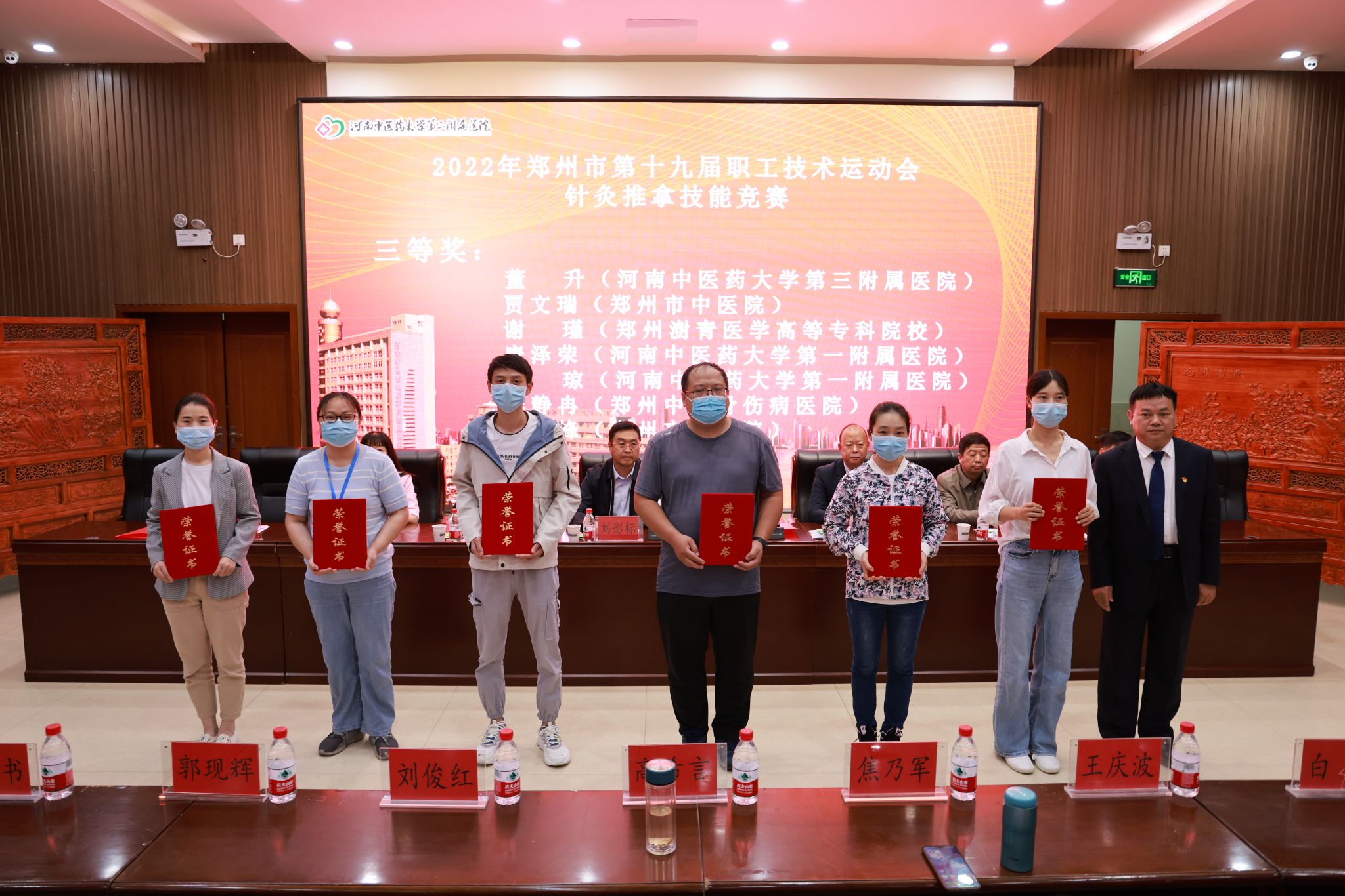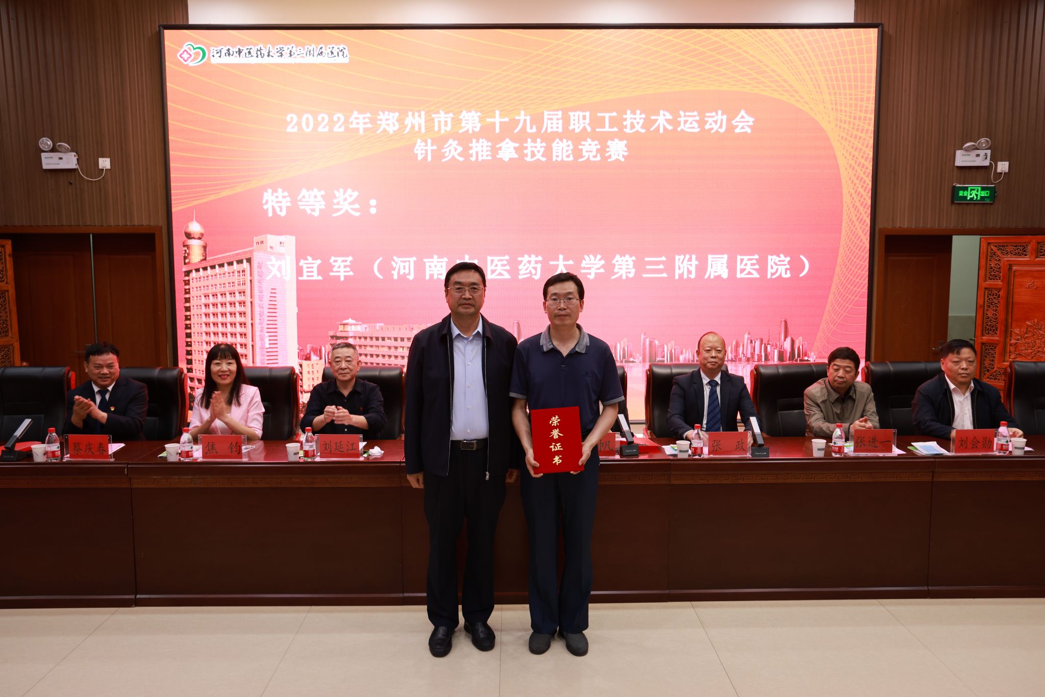 此次大赛采用理论和实践技能相结合的形式进行。理论笔试内容涉及针灸、推拿及中医经典等多方面知识,技能操作包括腧穴定位、刺法、温针灸、拔罐、推拿手法、推拿治疗等内容。在比赛现场,选手们展现出扎实的中医理论功底和娴熟的针灸推拿专业技能,现场精彩纷呈、亮点频现,经过激烈角逐,分别产生特等奖1名,一等奖2名,二等奖3名,三等奖7名,三附院刘宜军荣获特等奖,刘彤标主席为其颁奖。