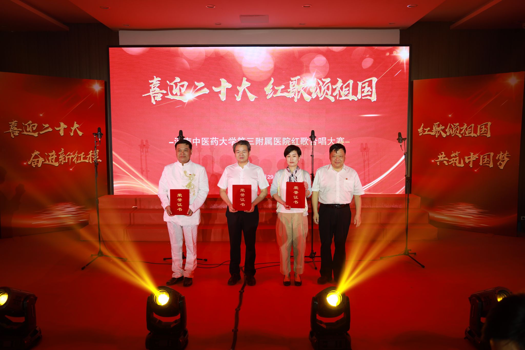 经过8个党总支16首红歌的精彩演绎和激烈的比拼,直属肛肠病医院党支部获得一等奖,药学党总支获得二等奖,机关党总支、针灸推拿党总支、内科二党总支获得三等奖,内科一党总支、医技党总支、外科党总支获得优秀组织奖。 院领导为获奖代表队一一颁奖祝贺。