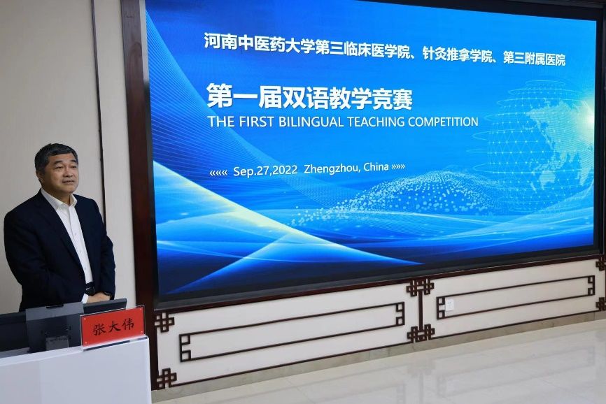 赛前,第三临床医学院院长张大伟对本次活动的精心组织给予充分肯定,他提出三点要求,一是双语教学是中华民族的振兴、复兴及中国文化走向世界的要求,教师需从根本上扭转思维观念,不断强化自身外语学习,适应内陆大省向开放强省转变的要求。二是根据大学转型发展及联合办学要求,需要更多的双语教学师资为学校的发展添砖加瓦。三是中医走向世界针灸推拿是先导,而语言是瓶颈,我们每位针灸推拿学院的教师都责无旁贷的要克服瓶颈、补齐短板带动中医走向世界。他希望参加比赛的选手赛出优异成绩,评委公平公正的给予评价的细心指导,并预祝竞赛圆满成功。