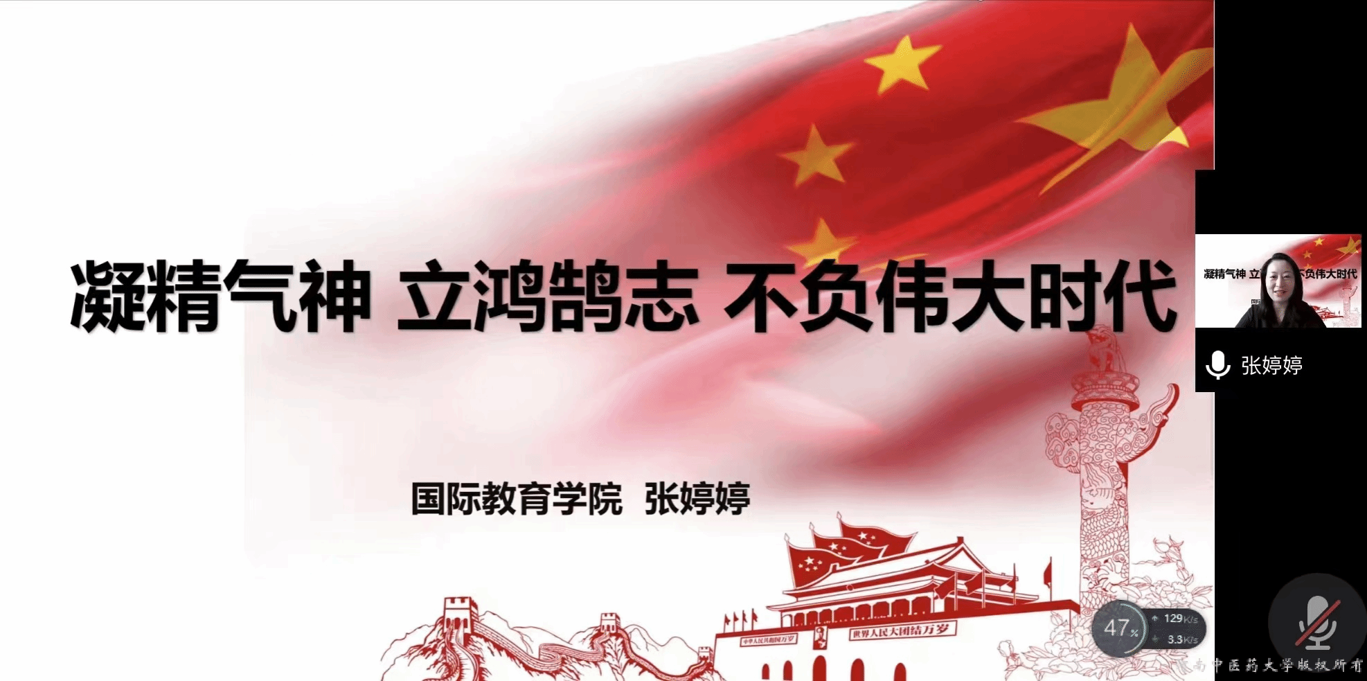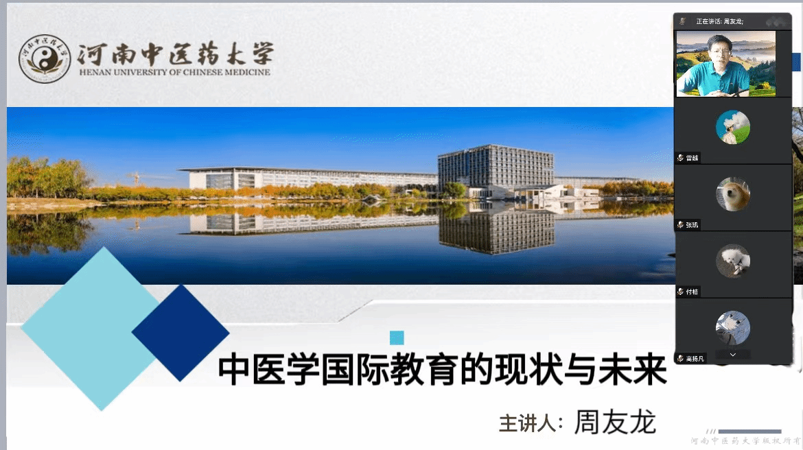 国际教育学院院长周友龙以“中医药国际教育的现状与未来”为题,介绍了中医药国际教育的发展现状和机遇挑战,对国际教育学院海外办学项目的学子们寄予厚望,鼓励同学们学好专业知识,勇担中医药国际化重任,为促进中医药走向世界做出贡献。