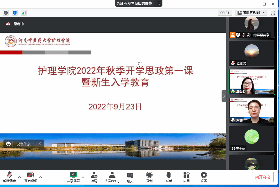 本网讯(文/谭亚男 高山 图/高山)在喜迎二十大召开之际,为切实做好2022级新生入学教育,贯彻落实立德树人根本任务,2022年9月23日下午,护理学院党委书记尹丽为2022级全体新生讲授秋季开学思政第一课并开展入学教育。护理学院党委副书记马慧玲、副院长刘玲霞、全体辅导员参加学习。开学第一课由马慧玲主持。