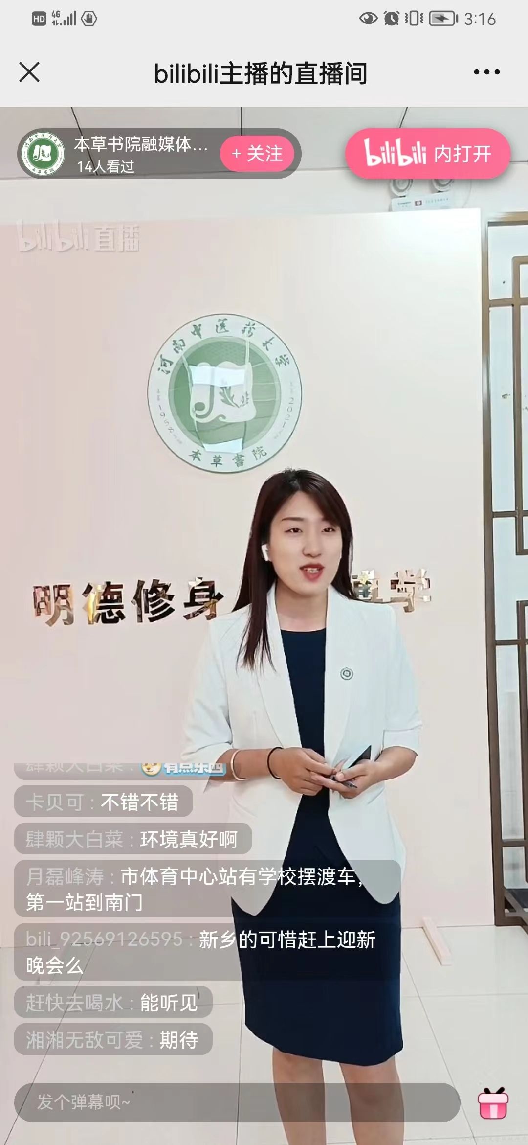 为使小萌新们进一步了解书院生活,当日下午本草书院又开启了一场“云”游书院的活动。育人导师带领新生走进书院社区,了解书院文化,参观远志学堂,走近创梦工坊,让书院新生切身感受书院育人环境,了解书院育人理念,看到书院丰富多彩的生活。直播过程中,同学们不断“打call”,不停“点赞”,因疫情未能按时报到的新生留言感叹“书院环境真好!希望能够尽快到学校去”。