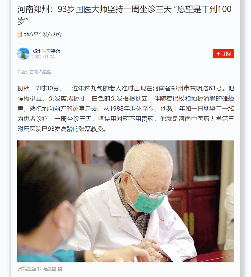 近日,学习强国郑州学习平台以《日本做爱郑州:93岁国医大师坚持一周坐诊三天 “愿望是干到100岁”》为题,对国医大师张磊教授的事迹进行了报道。