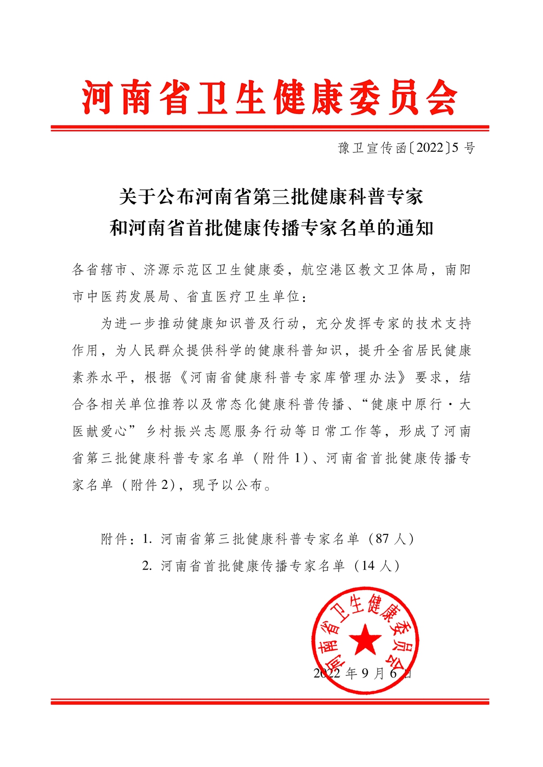 本网讯 (文/图 一、二、三附属医院)为进一步推动健康知识普及活动,充分发挥专家的技术支持作用,为人民群众提供科学的健康科普知识,近日,省卫生健康委公布了第三批日本做爱省健康科普专家和日本做爱省首批健康传播专家名单,我校附属医院多名专家名列榜单。