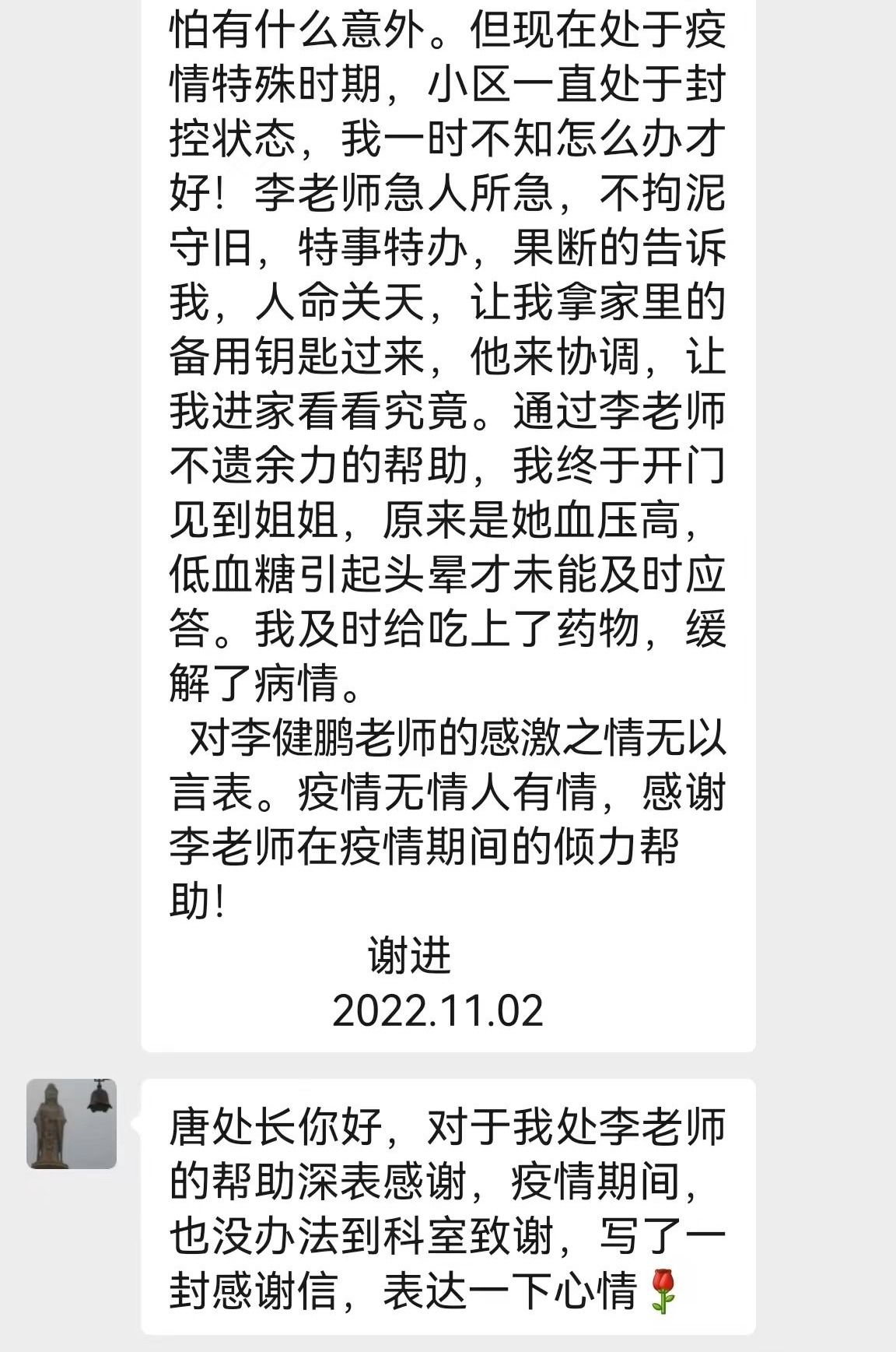 10月31日,一附院职工谢进焦急万分!因为小区封控,他无法到东明路家属院看望年迈且独居的姐姐。当天,他为姐姐团购好生活物资以后,就与其失去了联系。情急之下,他第一时间联系了离退处李健鹏,李老师二话不说,立刻动身去巡视敲门。生命至上,在采取敲门、视频通话等行动无果后,他不拘泥守旧,特事特办,紧急联系当事人进家中查看。待进门时发现老人已经处于晕厥状态,经过及时补药,老人高血压、低血糖的症状得到缓解,也渐渐恢复了意识。这场救援,关系生死,步步惊心,至此,多人紧绷的心才放松了下来。