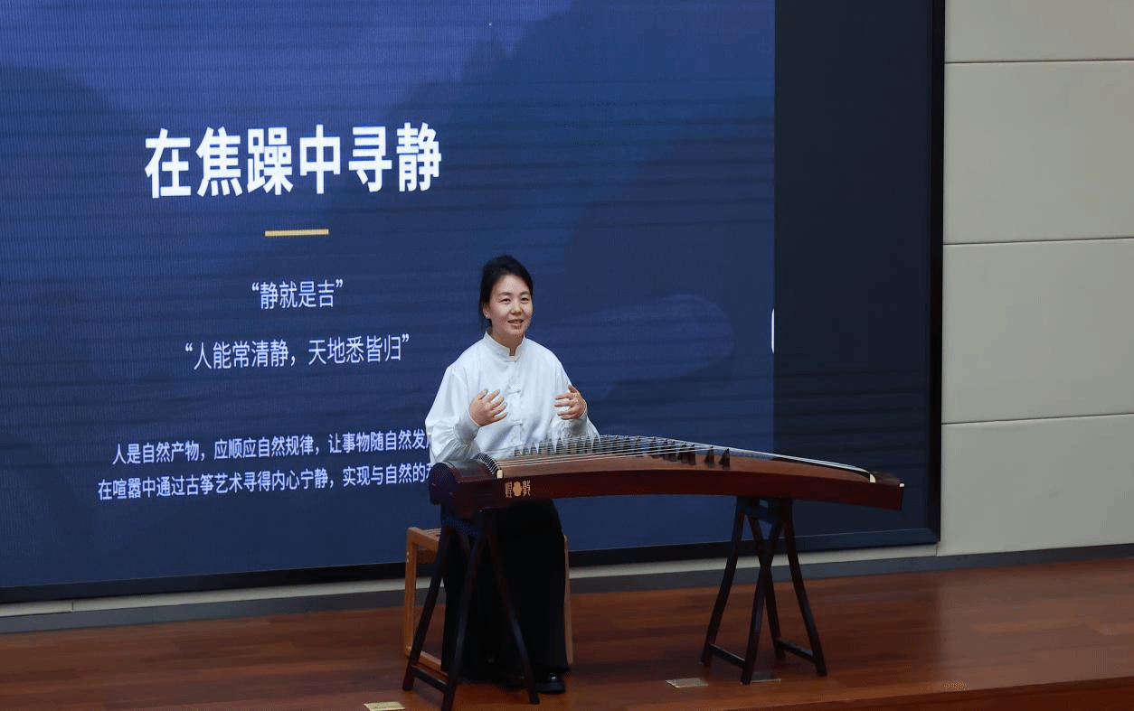 随后,四艺学堂本学期首场讲座同步开讲。本次讲座由中国音乐学院高级教师郑宗楠主讲,主题为“无用之用,方为大用——从‘外见’到‘内化’的古筝艺术”。郑宗楠以“美育是生活的‘灵丹妙药’”为切入点,巧妙关联中医药文化与美育:“美育注重滋养身心、提升精神境界,这与中医药‘治未病’、‘防患于未然’的健康理念本质相通,都是从根源上守护人的身心和谐。”她还系统梳理了古筝发展的历史脉络,解析其“岳山”“雁行”等部件蕴含的自然意象,并用经典曲目《春江花月夜》举例,带领师生感受古筝旋律中“江天一色、明月东升”的生态美学。“古筝或许不能直接满足物质需求,但它能在快节奏的生活中为我们守住一片精神栖息地。”郑宗楠强调,在AI技术快速发展的时代,审美力将成为人与人之间差异化竞争的核心竞争力,而传统文化正是培育审美力的重要土壤。这场兼具专业性与感染力的讲座,让师生对“美育与中医药文化融合”的内涵有了更深刻的认知。