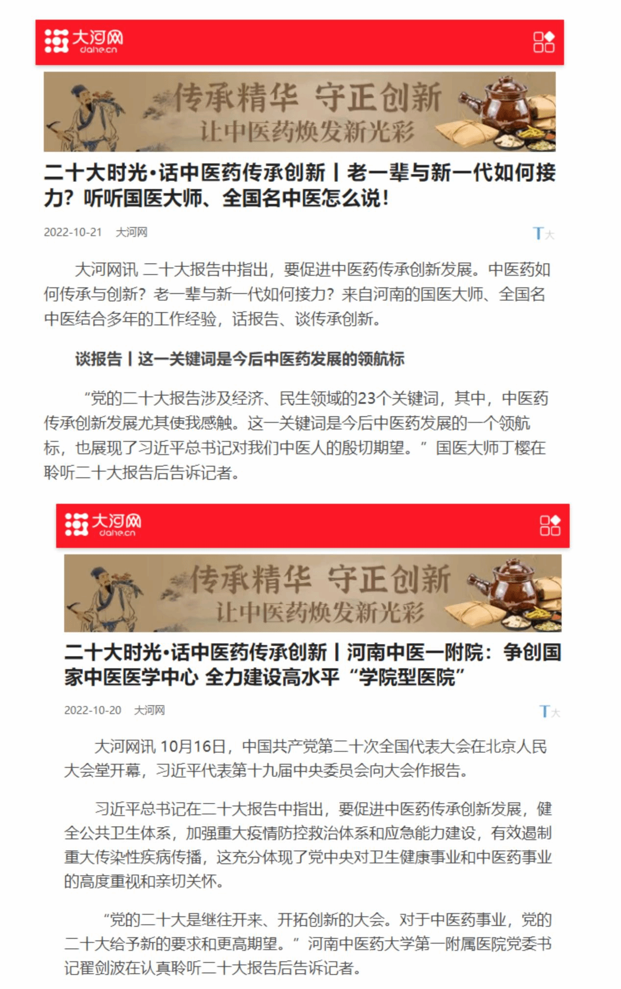 同时联合院外媒体,推出“二十大时光:争创国家中医医学中心 全力建设高水平‘学院型医院’”“二十大时光·话中医药传承创新丨老一辈与新一代如何接力?听听国医大师、全国名中医怎么说!”新闻报道,推动教职工生在学习中思考,在思考中提升。