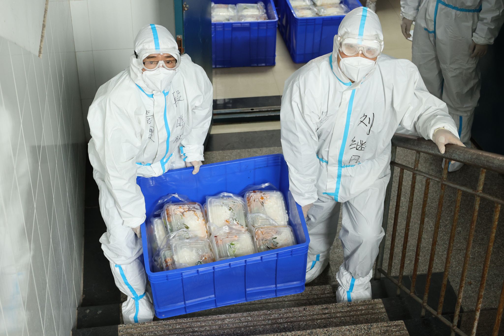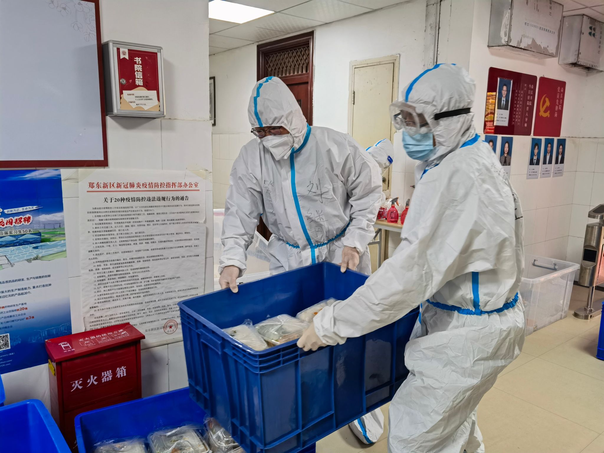 严重的体力透支,让身体素质一直较好的刘教授血压升高,领导和同事们劝他歇一歇,他说“我们两人包干两层楼为孩子们送饭,学院领导和同事们都在忙碌,特别是学院领导,强忍着腰伤爬楼梯,因为餐箱实在太重,一趟下来,腿直打哆嗦、腰更是直不起来,没有人叫苦退缩,我岂能下‘战场’。”就这样,他们这些“送餐员”,悄悄地克服着各自的困难,马不停蹄地奔波于楼宇之间。在长时间的送餐中,刘教授还和同事们一道,总结出了省时省力的经验窍门:一手拉着楼梯把手,一手拽着餐箱,一个人在前面借助把手的力往上拉,一个人在后面兜着底往上推。尽管如此,作为男教师,一趟送餐下来,手还是被100多斤的餐箱勒出了深深的红印,整个胳膊都在发抖,已然吃不消,而在送餐队伍中的女教师,也巾帼不让须眉,柔肩亦担重任。一天下来,在密不透风的防护服下爬楼梯,大家的衣服全部被汗水湿透,需要换洗两套衣服。在与时间赛跑的“送餐路”上,大家早已忘却性别、忘记身份,只为一个目的:“让被封闭在宿舍的孩子们吃热饭、吃好饭”。
