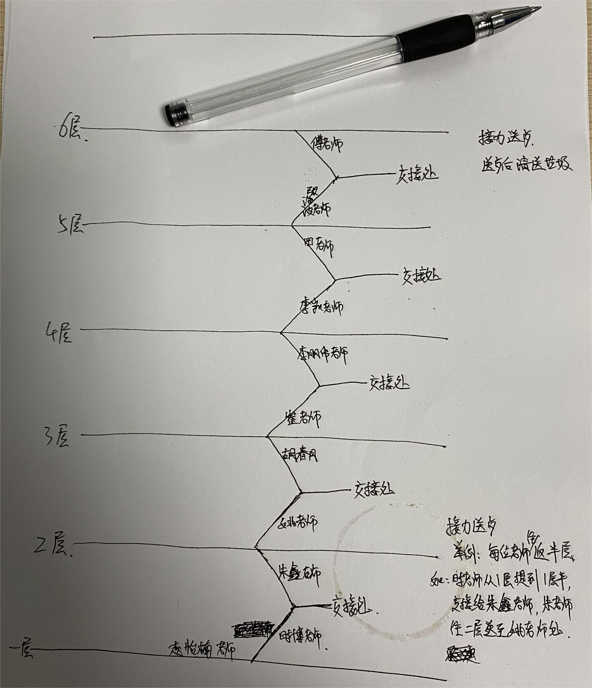“一张送餐方案图,只为学生吃上最热乎的饭菜”。每天工作结束,志愿者老师都会自发的聚在一起,复盘工作,交流想法,细化方案,优化流程,只为更精准、高效地把热乎乎的饭菜送到同学们手中。流水作业送餐上楼,接力传送生活垃圾,投放防疫中药包,送上泡面、水果、牛奶等爱心物资,每项工作井然有序,宿舍楼的每个角落都留下老师们忙碌地身影。白色防护服下的他们,是教授、博士,是领导、学者,此刻都化身大白穿梭在楼宇之间,虽汗流浃背却满面笑容,虽浑身酸痛第二天仍元气满满,一天三四万的步数计量着全体教师对书院学子深沉的爱与温暖。