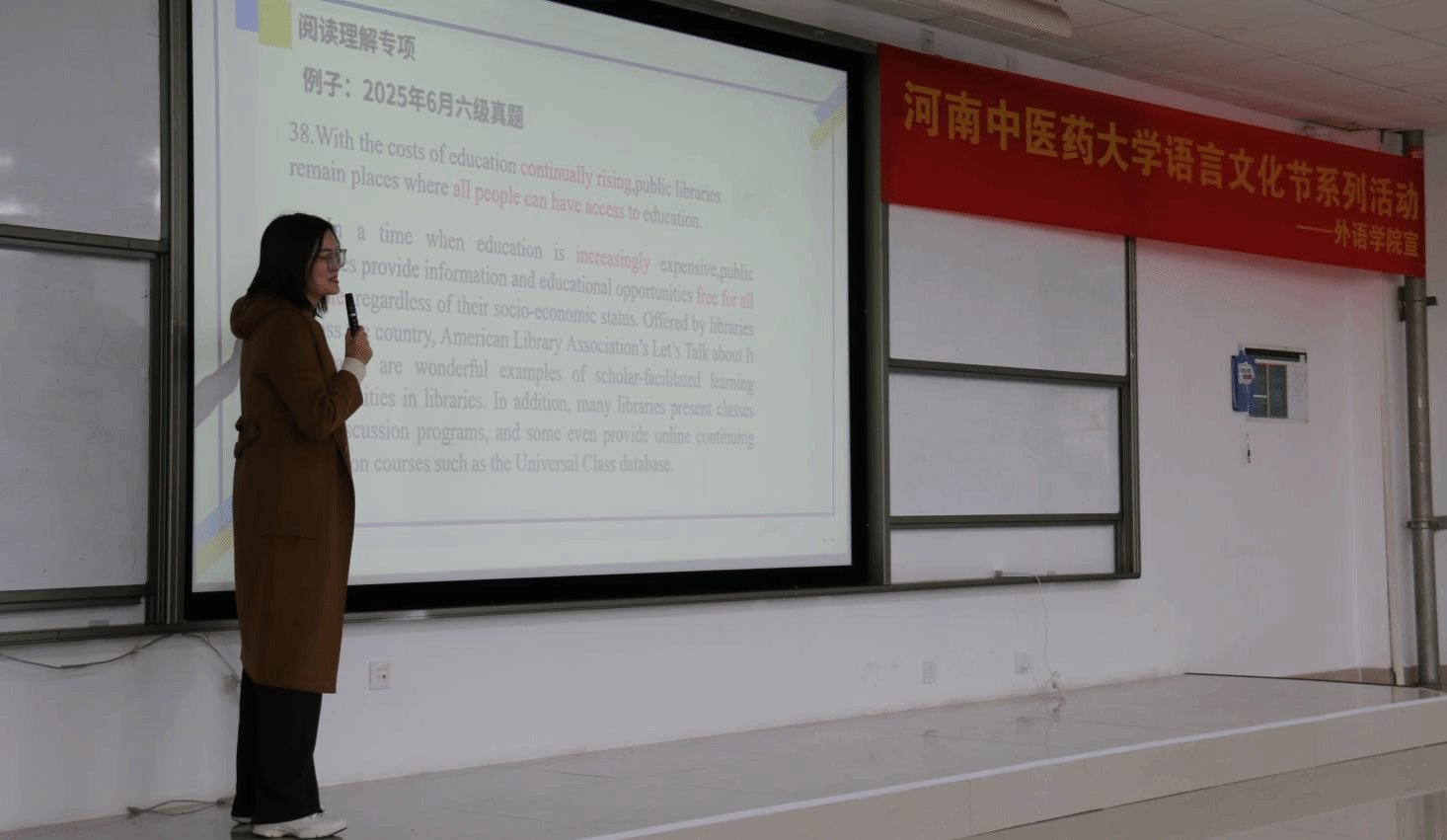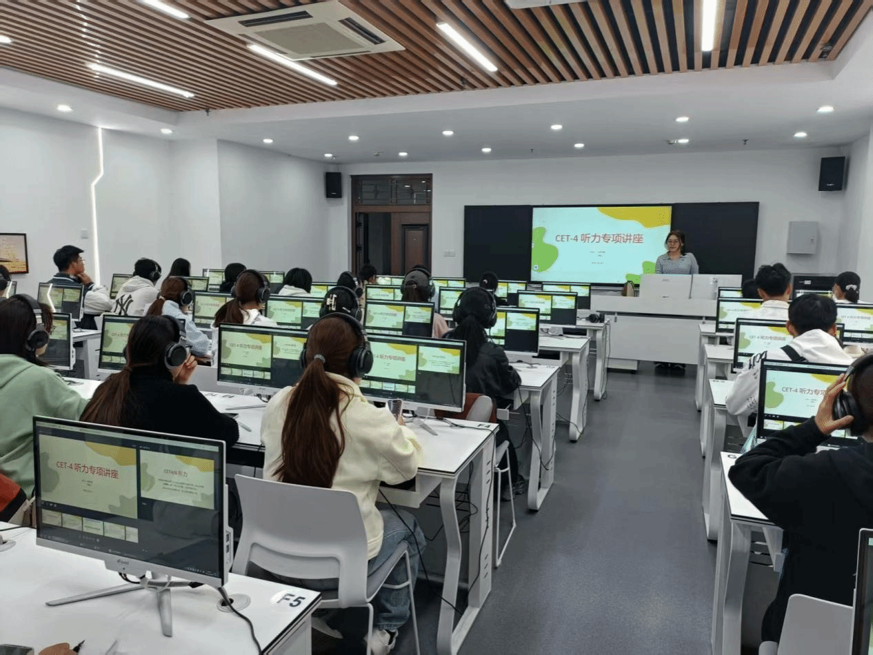 10月10日,“四级听力专题培训”在第9、第13语音室同步开展。根据前期调研,部分学生反映听力存在薄弱环节。王品、吕毅之两位老师紧扣学生实际需求,结合真题系统讲解各题型解题技巧,示范如何快速抓取关键信息、规避常见选项陷阱,并梳理近五年命题趋势,为学生指明复习方向。11月11日,王琳琳老师主讲了四六级考前冲刺专题讲座。她从宏观层面梳理全阶段备考策略,并聚焦阅读与写作两大题型,结合真题细致讲解解题思路与高分技巧。针对考前关键阶段,她特别总结了命题规律,强调了考试注意事项,帮助学生夯实基础、增强信心。