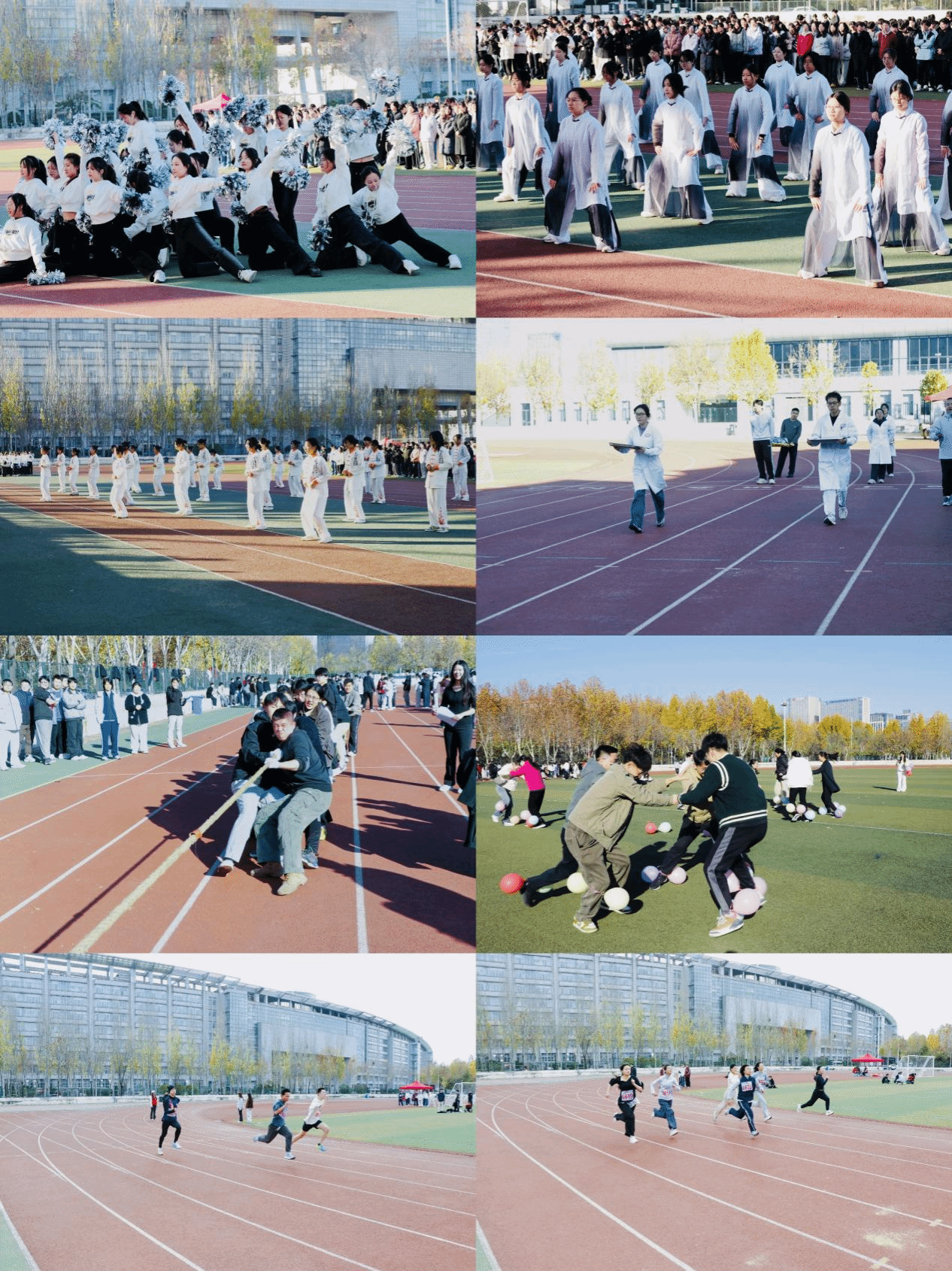 开幕式表演精彩纷呈。八段锦柔中带刚,尽展中医养生智慧;五禽戏灵动传神,融专业特色于体育文化;啦啦操活力四射,点燃全场热情,将开幕氛围推向高潮。赛事设置紧扣专业,趣味与竞技并重。护理技能接力赛作为特色项目,巧妙融入抱婴儿模拟护理、担架救援、托盘竞走等场景,实现“专业+体育”的有机融合。教师专场中,踩气球等趣味项目妙趣横生,展现了教师们课堂之外的活力风采。田径赛场上,接力跑、中长跑等项目轮番上演,选手们挥洒汗水、奋勇争先;拔河比赛中,各班凝心聚力、气势如虹,呐喊声此起彼伏,彰显出强大的集体凝聚力。赛场内,运动员全力以赴;赛场外,志愿者倾情服务,观众热情助威,共同绘就了一幅团结拼搏、奋发向上的动人画卷。