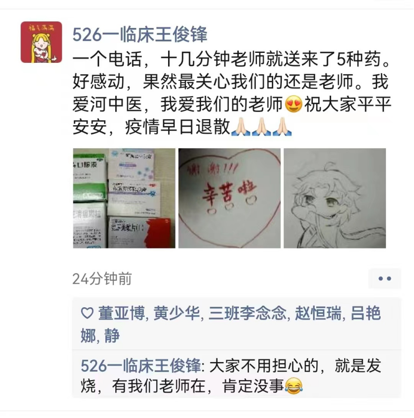 与时间赛跑,与病毒较量。自今年9月28日起,院团委书记、学工办主任陈占科,和学工办魏天贵、张文鑫、李新宇四名男士主动承担起驻守校园一线任务。白纸上写完“坚守”二字只需三秒,现实中陈占科“坚守”已达51天。4个月前,他刚做髌骨骨折手术,忘了腿中钢钉,这些天日行2万余步,送药、送抗原、转运、协调、反馈并解决问题,他用沉稳、勇气和担当,肩负起学工办“第一负责人”的使命任务。魏天贵转战两个校区,当过“大白”采集核酸,做过临时“大夫”,也做过“跑腿”帮学生送药取药,与两个孩子微信聊天时那爽朗的笑便是最动人的一幕。张文鑫,留校30多天,他喜欢校园中同学们的纯真笑容,思念家中的一对儿女。为抗击疫情,校园安静下来了,家里的牵挂也愈发浓烈,而他顾不上这一切,积极投身一线,电话微信不断,送餐保障不停。遇到困难和突发情况,他虽会不安,但始终奔赴一线,无论是凌晨的转运,还是深夜的突发事件处理,始终输出着决心和信心。忙乱中他显得严厉,感动时他会哭泣,这样的坚守他还在持续。李新宇在条件最为艰苦、形势最为严峻的东明路校区一住就是20余天,白天穿着厚厚的防护服帮忙转运,晚上整理各项通知政策。稍有空闲,席地而坐,想起来还有其他任务,喘个大气,告诉自己干就完了,接着拼。这里,还有医院的6名志愿者们,他们通力合作,执行餐饮供应、中药配发、垃圾清运、楼道消杀等任务。他们用睡眠与时间交易,用责任扛起一线任务。学生们的一日三餐、生病时服用的药、空气中弥漫的消毒水味、干净整洁的宿舍、有序的转运,都是他们“舍小家,为大家”,用心、用力、用情奋战出来的。