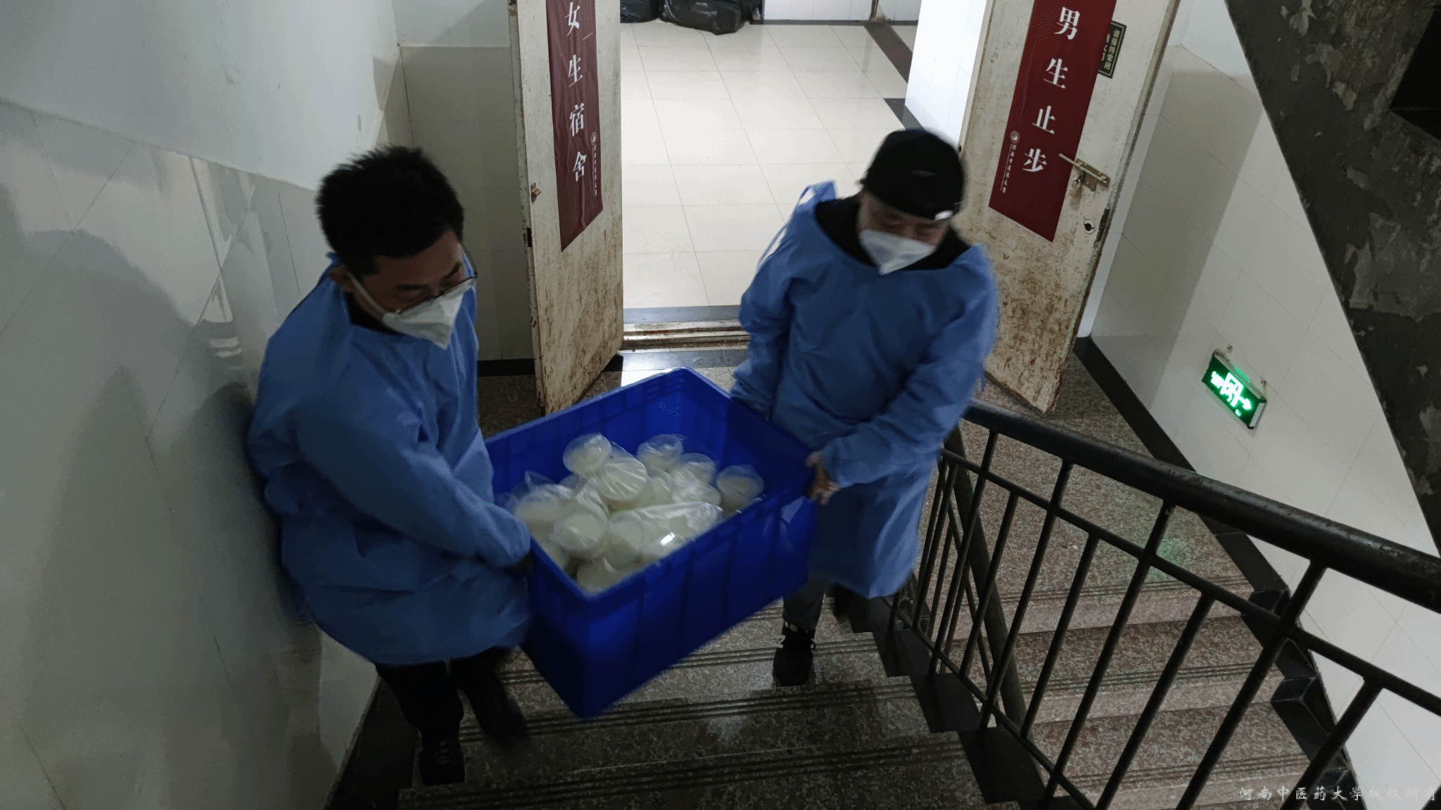 11月10日下午,疫情防控形势升级,学生开始静默管理,学校组织教师志愿者队伍为学生们送餐。栗俞程教授没有犹豫,立刻报名参加了为学生送餐的志愿者队伍,和中医药科学院领导和老师们一起化身“送餐大白”,负责研究生9号楼的送餐任务,一日三餐,每餐数吨饭菜餐,都需要老师们多次往返从楼层门口手抬到4、5、6层,这对体力是一个不小的考验。有时,除了送餐,还有为同学们准备的抗疫中药、水果、牛奶等均需要抬上楼发到学生手中。每次送餐结束,栗俞程教授都是浑身酸痛,汗水浸湿了衣服,脸上也留下深深的口罩印,但他从来不提苦累,不提条件,依然坚守岗位。栗俞程教授对于志愿服务和科研任务认真负责的态度都是始终如一的,送完一日三餐拖着疲惫的身体回到实验室常常都10点多了,但栗俞程教授的科研工作才刚刚开始,除了督促学生主动学习、布置相关学习任务,审阅研二学生的开题报告、修改研三学生的论文、备课做课件、写课题标书等等,不知不觉,结束这些经常已是深夜两三点,简单休息上三四个小时,6点多又起床为学生们准备送餐。就这样,栗俞程教授这样送餐加科教结合的充实生活坚持了一周多,要说不辛苦是假的,但看到学生们给老师们写心声独白,心里就一片暖意,身上顿时充满了干劲,觉得一切辛苦和劳累都是值得的。